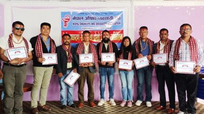 दोलखाका औषधि पसलमा एप्रोनसहितका फर्मासिष्ट