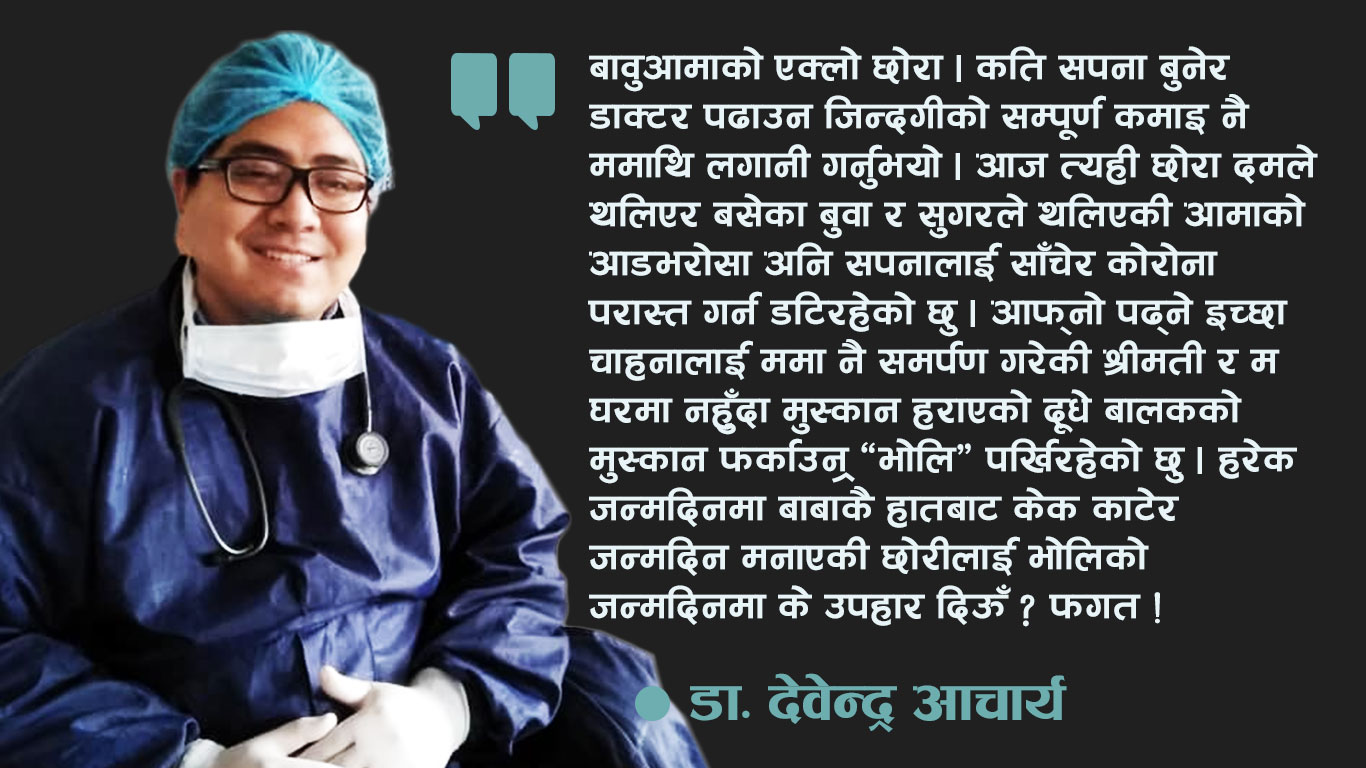 यता परिवारको तनाव छुट्टै छ । बावुआमाको एक्लो छोरा । कति सपना बुनेर डाक्टर पढाउन जिन्दगीको सम्पूर्ण कमाइ नै ममाथि लगानी गर्नुभयो । आज त्यही छोरा दमले थलिएर बसेका बुवा र सुगरले थलिएकी आमाको आडभरोसा अनि सपनालाई साँचेर कोरोना परास्त गर्न डटिरहेको छु । आफ्नो पढ्ने इच्छा चाहनालाई ममा नै समर्पण गरेकी श्रीमती र म घरमा नहुँदा मुस्कान हराएको दूधे बालकको मुस्कान फर्काउन ‘भोलि’ पर्खिरहेको छु । हरेक जन्मदिनमा बाबाकै हातबाट केक काटेर जन्मदिन मनाएकी छोरीलाई भोलिको जन्मदिनमा के उपहार दिऊँ ? फगत ! यो देशमा डाक्टरको पीडा सुनिदिने सरकार छैन् । कसलाई पोखूँ मेरो वेदना ?