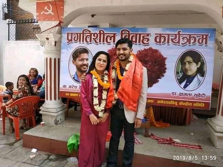 डा. क्षमता सुवेदी र तत्कालीन माओवादी केन्द्र निकट अनेरास्ववियु क्रान्तिकारीका केन्द्रीय सचिव नरेश रेग्मी शर्माको जनवादी विवाहको दृश्य हो यो । सोमबार विहान उनीहरुले पेरिसडाँडास्थित नेकपाको कार्यलयमा जनवादी विवाह गरेका हुन् ।