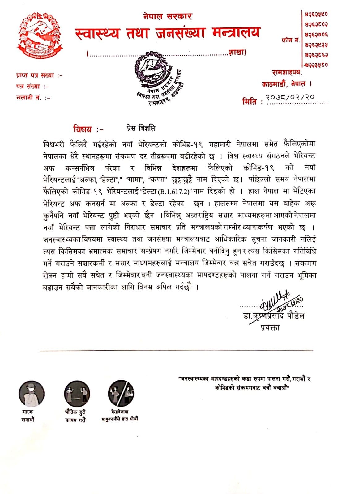 गृहपृष्ठ ∕ समाचार ∕ स्वास्थ्य मन्त्रालयले भन्यो, ‘नेपाल भेरियन्ट’ भेटिएको छैन, भ्रामक सूचना सम्प्रेषण नगरौँ’ स्वास्थ्य मन्त्रालयले भन्यो, ‘नेपाल भेरियन्ट’ भेटिएको छैन, भ्रामक सूचना सम्प्रेषण नगरौँ’ हेल्थ आवाज बिहीबार, २०७८ जेठ २० गते, १७:४९ मा प्रकाशित तस्वीरः नवराज वाग्ले/हेल्थआवाज काठमाडौँ – स्वास्थ्य मन्त्रालयले नेपालमा कोभिडको छुट्टै नयाँ भेरियन्ट फैलिएको भन्ने लेखहरुमा कुनै सत्यता नभएको जनाएको छ। विभिन्न अन्तर्राष्ट्रिय संचारमाध्यममा नेपालमा छुट्टै नयाँ भेरियन्ट फैलिएको भन्ने समाचार आएपछि बिहिबार मन्त्रालयले सूचना जारी गर्दै त्यसमा कुनै सत्यता नभएको जनाएको हो। मन्त्रालयका प्रवक्ता डा. कृष्णप्रसाद पौडेलले अहिलेसम्म नेपालमा छुट्टै भेरियन्ट पुष्टि नभएको बताएका छन्। उनले स्वास्थ्य मन्त्रालयको आधिकारिक जानकारी नलिई भ्रामक समाचार सम्प्रेषण नगर्न आग्रह समेत गरेका छन्। हाल नेपालमा भाइरस अफ कन्सर्न अन्तरर्गत अल्फा र डेल्टा भेरियन्ट मात्र देखिएको मन्त्रालयले जनाएको छ। क्याटेगोरी : समाचार तपाईको प्रतिक्रिया दिनुहोस सम्बन्धित समाचार हेलो सरकारबाट प्राप्त गुनासो सम्बोधनका लागि फोकल पर्सन तोक्न ४६… भरतपुर अस्पतालको मेसुमा डा. विश्वबन्धु बगाले नियुक्त कार्यालय समयमा अनुपस्थित रहने कर्मचारीलाई तह लगाउन वीर अस्पताल व्यवस्थापनका… नवौं र दशौं तहका १४ जना विशेषज्ञ चिकित्सकको काज फिर्ता वैदेशिक रोजगारमा जाने कामदारको स्वास्थ्य परीक्षण अब सरकारी स्वास्थ्य संस्थाबाट… खाद्य प्रविधि तथा गुण नियन्त्रण विभागका प्राविधिक सहायक चौधरी अख्तियारको… धेरै पढिएका १ नेपाल हियरिङ एण्ड स्पीच क्लिनिकमार्फत ४० वर्षीय पुरुषोत्तम भुर्तेलको व्यवसायिक उडान २ सरकारी जागिरे डा. रोशन पिजीका इन्ट्रान्स टपर ३ बालबालिकामा देखिने दन्त सडनः अर्ली चाइल्डहुड केरिज ४ ४ अर्ब लगानीमा बनेको ३०० शय्याको सन्जीवनी टिचिङ हस्पिटल माघ मसान्तबाट सञ्चालनमा आउने ५ मनमोहन प्राविधिक विश्वविद्यालयको प्रस्तावः धनकुटा अस्पताललाई ३०० शय्याको शिक्षण अस्पताल बनाउने ६ गर्भपतन गर्दा के कुरामा ध्यान दिने ? गर्भपतनपछि आउन सक्छन् यस्ता जटिलता ७ रोबोटिक सर्जरी क्यान्सर उपचारको नयाँ विकल्प : विज्ञ TFN ट्रेण्डिङ कार्यालय समयमा अनुपस्थित रहने कर्मचारीलाई तह लगाउन वीर अस्पताल व्यवस्थापनका एक दर्जन बढी निर्णय सरकारी जागिरे डा. रोशन पिजीका इन्ट्रान्स टपर हुम्लाका डा. उमाकान्त तिवारीलाई हेल्थ अवार्ड नेपाल हियरिङ एण्ड स्पीच क्लिनिकमार्फत ४० वर्षीय पुरुषोत्तम भुर्तेलको व्यवसायिक उडान डा. जितप्रकाश श्रेष्ठः सरकमसिजन के हो ? यो किन गरिन्छ ? नवौं र दशौं तहका १४ जना विशेषज्ञ च