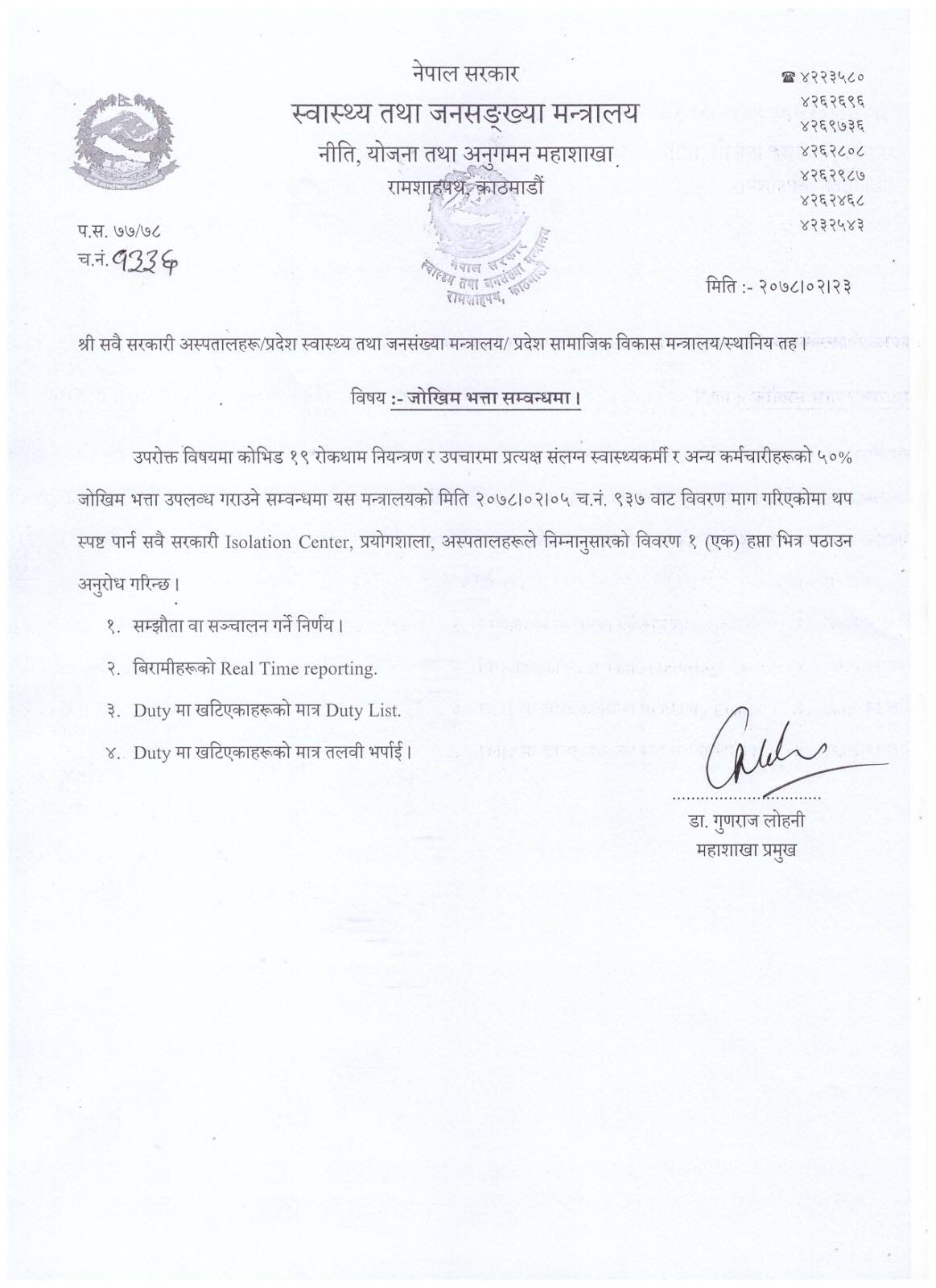 गृहपृष्ठ ∕ समाचार ∕ स्वास्थ्यकर्मीको जोखिम भत्ताका लागि १ साताभित्र विवरण पठाउन स्वास्थ्य मन्त्रालयको निर्देशन स्वास्थ्यकर्मीको जोखिम भत्ताका लागि १ साताभित्र विवरण पठाउन स्वास्थ्य मन्त्रालयको निर्देशन हेल्थ आवाज आईतबार, २०७८ जेठ २३ गते, १५:३६ मा प्रकाशित तस्वीरः नवराज वाग्ले/हेल्थआवाज काठमाडौँ – स्वास्थ्य तथा जनसंख्या मन्त्रालयले कोभिड-१९ उपचारमा खटिएका स्वास्थ्यकर्मीलाई ५० प्रतिशत भत्ता उपलब्ध गराउन विवरण माग गरेको छ। मन्त्रालयले आइतबार पत्राचार गरी सबै सरकरी अस्पताल, प्रदेश स्वास्थ्य तथा जनसंख्या मन्त्रालय, सामाजिक विकास मन्त्रालय र स्थानीय तहलाई कोभिड-१९ उपचारमा खटिएका स्वास्थ्यकर्मी र अन्य कर्मचारीको विवरण माग गरेको हो। मन्त्रालयले सम्झौता वा सञ्चालन गर्ने निर्णय, बिरामीको रियल टाइम रिपोर्टिङ, ड्युटीमा खटिएकाहरु मात्र ड्युटी लिष्ट र ड्युटीमा खटिएकाहरुको मात्र तलबी भर्पाई विवरण माग गरेको हो। सो विवरण एकसाताभित्र बुझाइसक्नु पर्ने मन्त्रालयले जनाएको छ। क्याटेगोरी : समाचार तपाईको प्रतिक्रिया दिनुहोस सम्बन्धित समाचार हेलो सरकारबाट प्राप्त गुनासो सम्बोधनका लागि फोकल पर्सन तोक्न ४६… भरतपुर अस्पतालको मेसुमा डा. विश्वबन्धु बगाले नियुक्त कार्यालय समयमा अनुपस्थित रहने कर्मचारीलाई तह लगाउन वीर अस्पताल व्यवस्थापनका… नवौं र दशौं तहका १४ जना विशेषज्ञ चिकित्सकको काज फिर्ता वैदेशिक रोजगारमा जाने कामदारको स्वास्थ्य परीक्षण अब सरकारी स्वास्थ्य संस्थाबाट… खाद्य प्रविधि तथा गुण नियन्त्रण विभागका प्राविधिक सहायक चौधरी अख्तियारको… धेरै पढिएका १ नेपाल हियरिङ एण्ड स्पीच क्लिनिकमार्फत ४० वर्षीय पुरुषोत्तम भुर्तेलको व्यवसायिक उडान २ सरकारी जागिरे डा. रोशन पिजीका इन्ट्रान्स टपर ३ बालबालिकामा देखिने दन्त सडनः अर्ली चाइल्डहुड केरिज ४ ४ अर्ब लगानीमा बनेको ३०० शय्याको सन्जीवनी टिचिङ हस्पिटल माघ मसान्तबाट सञ्चालनमा आउने ५ मनमोहन प्राविधिक विश्वविद्यालयको प्रस्तावः धनकुटा अस्पताललाई ३०० शय्याको शिक्षण अस्पताल बनाउने ६ गर्भपतन गर्दा के कुरामा ध्यान दिने ? गर्भपतनपछि आउन सक्छन् यस्ता जटिलता ७ रोबोटिक सर्जरी क्यान्सर उपचारको नयाँ विकल्प : विज्ञ TFN ट्रेण्डिङ कार्यालय समयमा अनुपस्थित रहने कर्मचारीलाई तह लगाउन वीर अस्पताल व्यवस्थापनका एक दर्जन बढी निर्णय सरकारी जागिरे डा. रोशन पिजीका इन्ट्रान्स टपर नेपाल हियरिङ एण्ड स्पीच क्लिनिकमार्फत ४० वर्षीय पुरुषोत्तम भुर्तेलको व्यवसायिक उडान हुम्लाका डा. उमाकान्त तिवारीलाई हेल्थ अवार्ड डा. जितप्रकाश श्रेष्ठः सरकमसिजन के हो ? यो किन गरिन्छ ? नवौं र दशौं तहका १४ जना विशेषज्ञ चिकित्सकको क