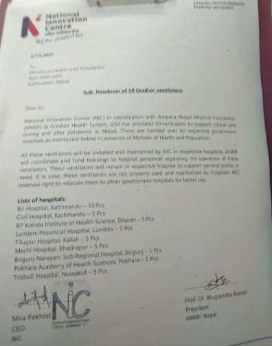 नेपाल-अमेरिका मेडिकल फाउन्डेसन र ग्रेडिएन हेल्थ सिस्टमको सहयोगमा राष्ट्रिय आविस्कार केन्द्रमार्फत सोमबार ५० थान भेन्टिलेटर स्वास्थ्य मन्त्रालयअन्तर्गत ९ वटा सरकारी अस्पताललाई हस्तान्तरण गरिएको छ ।