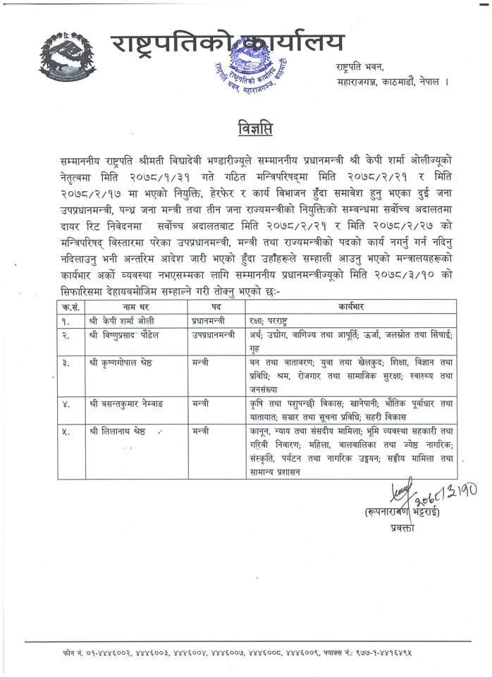 उनी शिक्षा, विज्ञान तथा प्रविधि मन्त्री पनि हुन् । प्रधानमन्त्री ओलीले उनलाई स्वास्थ्य मन्त्रालयसँगै वन तथा वातावरण, युवा तथा खेलकूद, श्रम, रोजगार तथा सामाजिक विकास मन्त्रालयको समेत जिम्मेवारी दिएका छन् ।