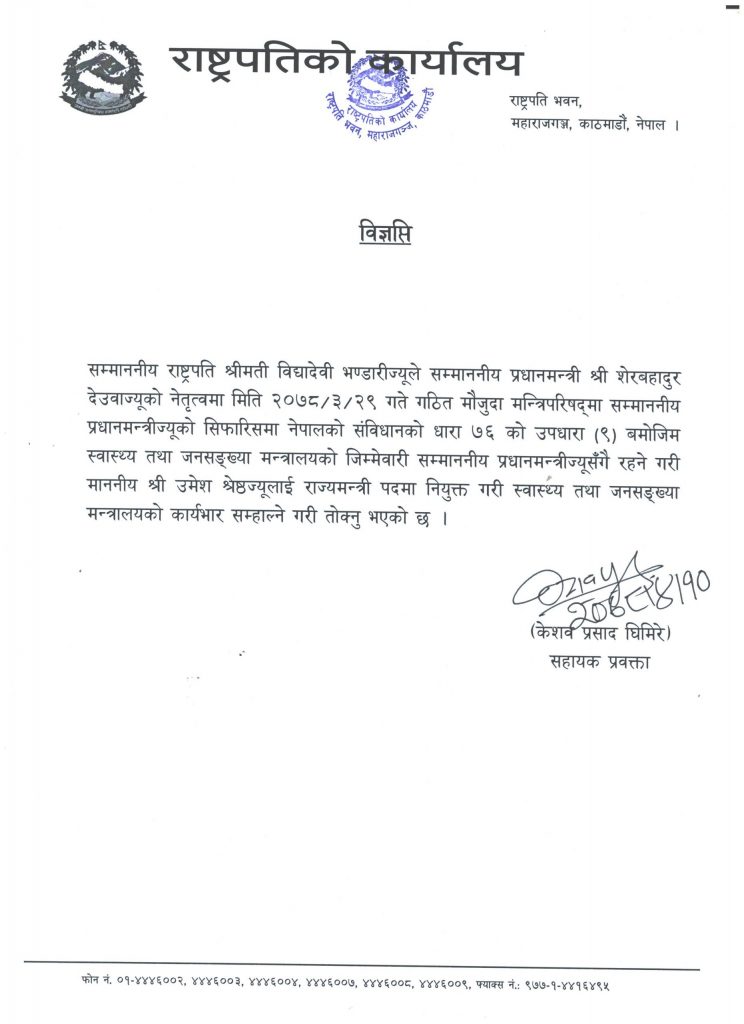गृहपृष्ठ ∕ समाचार ∕ उमेश श्रेष्ठ स्वास्थ्य राज्यमन्त्री नियुक्त उमेश श्रेष्ठ स्वास्थ्य राज्यमन्त्री नियुक्त हेल्थ आवाज आईतबार, २०७८ साउन १० गते, १५:४५ मा प्रकाशित काठमाडौं—व्यवसायी उमेश श्रेष्ठ स्वास्थ्य तथा जनसंख्या राज्यमन्त्री नियुक्त भएका छन् । आइतबार प्रधानमन्त्री शेरबहादुर देउवाको सिफारिसमा राष्ट्रपति विद्यादेवी भण्डारीले श्रेष्ठलाई स्वास्थ्य राज्यमन्त्रीमा नियुक्त गरेकी हुन् । उनी हात्तीवनस्थित लिटिल एन्जल्स स्कुलका संस्थापक तथा अध्यक्ष हुन् । श्रेष्ठको अन्य विभिन्न क्षेत्रमा पनि लगानी रहेको छ । उनी नेपाली कांग्रेसबाट समानुपातिक सांसद हुन् । स्वास्थ्य मन्त्री नहुँदा कोभिड—१९ प्रतिकार्य प्रभावकारी नभएको आवाज उठिरहेका बेला प्रधानमन्त्री देउवाले राज्यमन्त्री नियुक्त गरेका हुन् । स्वास्थ्य मन्त्रीको जिम्मेवारी भने प्रधानमन्त्रीले आफैसँग राखेका छन् । क्याटेगोरी : समाचार तपाईको प्रतिक्रिया दिनुहोस सम्बन्धित समाचार स्वास्थ्य क्षेत्र सुधारका लागि दुई वर्षअघि रास्वपाले बुझाएको २६ बुँदे… शहीद दशरथ चन्द स्वास्थ्य विज्ञान विश्वविद्यालयको सिनेट बैठक पहिलो पटक… हेलो सरकारबाट प्राप्त गुनासो सम्बोधनका लागि फोकल पर्सन तोक्न ४६… भरतपुर अस्पतालको मेसुमा डा. विश्वबन्धु बगाले नियुक्त कार्यालय समयमा अनुपस्थित रहने कर्मचारीलाई तह लगाउन वीर अस्पताल व्यवस्थापनका… नवौं र दशौं तहका १४ जना विशेषज्ञ चिकित्सकको काज फिर्ता धेरै पढिएका १ नेपाल हियरिङ एण्ड स्पीच क्लिनिकमार्फत ४० वर्षीय पुरुषोत्तम भुर्तेलको व्यवसायिक उडान २ सरकारी जागिरे डा. रोशन पिजीका इन्ट्रान्स टपर ३ गर्भपतन गर्दा के कुरामा ध्यान दिने ? गर्भपतनपछि आउन सक्छन् यस्ता जटिलता ४ रोबोटिक सर्जरी क्यान्सर उपचारको नयाँ विकल्प : विज्ञ ५ ३८ वर्षीया निशा मेहता स्वास्थ्य तथा जनसंख्यामन्त्री नियुक्त ६ एएमएसपी सम्बन्धि दुई दिने कार्यशाला गोष्ठी सम्पन्न ७ ३८ वर्षीया निशा मेहता स्वास्थ्य तथा जनसंख्यामन्त्री बन्दै TFN ट्रेण्डिङ स्वास्थ्य क्षेत्र सुधारका लागि दुई वर्षअघि रास्वपाले बुझाएको २६ बुँदे अवधारणा : सरकारलाई कार्यान्वय गर्ने अवसर कार्यालय समयमा अनुपस्थित रहने कर्मचारीलाई तह लगाउन वीर अस्पताल व्यवस्थापनका एक दर्जन बढी निर्णय नेपाल हियरिङ एण्ड स्पीच क्लिनिकमार्फत ४० वर्षीय पुरुषोत्तम भुर्तेलको व्यवसायिक उडान छोरीको साहसले बुवालाई दियो नयाँ जीवन हेलो सरकारबाट प्राप्त गुनासो सम्बोधनका लागि फोकल पर्सन तोक्न ४६ निकायलाई स्वास्थ्य मन्त्रालयको परिपत्र वीरमा प्रमुख विशेषज्ञसहित ८ सय ३१ पुल* दरबन्दी थप, प्रशासनमा सहसचिव खाद्य प्रविधि तथा गुण नियन्त्रण विभागका 