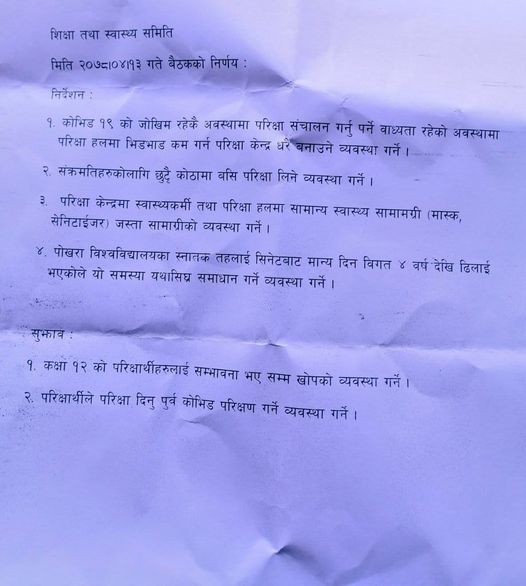 गृहपृष्ठ ∕ समाचार ∕ कक्षा १२को परीक्षा केन्द्रमा स्वास्थ्यकर्मी राख्न शिक्षा समितिको निर्देशन कक्षा १२को परीक्षा केन्द्रमा स्वास्थ्यकर्मी राख्न शिक्षा समितिको निर्देशन हेल्थ आवाज बुधबार, २०७८ साउन १३ गते, १५:१६ मा प्रकाशित सांकेतिक तस्वीर काठमाडौँ – संसदको शिक्षा तथा स्वास्थ्य समितिले परीक्षा केन्द्रमा स्वास्थ्यकर्मी राख्न निर्देशन दिएको छ। बुधबार बसेको प्रतिनिधिसभाको शिक्षा तथा स्वास्थ्य समितिको बैठकले साउने ३१ देखि हुने १२ कक्षाको परीक्षा केन्द्रमा कम्तिमा एउटा स्वास्थ्यकर्मी र परीक्षा हलमा स्वास्थ्यका सामग्री राख्न निर्देशन दिएको हो। कोभिड संक्रमणलाई मध्यनजर गर्दै संक्रमितको परीक्षाका लागि छुटै हल व्यवस्था गर्ने, परीक्षा केन्द्रमा भिडभाड हुन् नदिने, सकेसम्मधेरै केन्द्र बनाउन पनि समितिले निर्देशन दिएको छ। त्यस्तै, समितिले सम्भब भएसम्म कक्षा १२ को परीक्षाअघि नै विद्यार्थीलाई खोप दिन र कोभिड परीक्षण गर्न सरकारलाई सुझाव दिएको छ । क्याटेगोरी : समाचार तपाईको प्रतिक्रिया दिनुहोस सम्बन्धित समाचार स्वास्थ्य क्षेत्र सुधारका लागि दुई वर्षअघि रास्वपाले बुझाएको २६ बुँदे… शहीद दशरथ चन्द स्वास्थ्य विज्ञान विश्वविद्यालयको सिनेट बैठक पहिलो पटक… हेलो सरकारबाट प्राप्त गुनासो सम्बोधनका लागि फोकल पर्सन तोक्न ४६… भरतपुर अस्पतालको मेसुमा डा. विश्वबन्धु बगाले नियुक्त कार्यालय समयमा अनुपस्थित रहने कर्मचारीलाई तह लगाउन वीर अस्पताल व्यवस्थापनका… नवौं र दशौं तहका १४ जना विशेषज्ञ चिकित्सकको काज फिर्ता धेरै पढिएका १ नेपाल हियरिङ एण्ड स्पीच क्लिनिकमार्फत ४० वर्षीय पुरुषोत्तम भुर्तेलको व्यवसायिक उडान २ सरकारी जागिरे डा. रोशन पिजीका इन्ट्रान्स टपर ३ गर्भपतन गर्दा के कुरामा ध्यान दिने ? गर्भपतनपछि आउन सक्छन् यस्ता जटिलता ४ रोबोटिक सर्जरी क्यान्सर उपचारको नयाँ विकल्प : विज्ञ ५ ३८ वर्षीया निशा मेहता स्वास्थ्य तथा जनसंख्यामन्त्री नियुक्त ६ एएमएसपी सम्बन्धि दुई दिने कार्यशाला गोष्ठी सम्पन्न ७ ३८ वर्षीया निशा मेहता स्वास्थ्य तथा जनसंख्यामन्त्री बन्दै TFN ट्रेण्डिङ स्वास्थ्य क्षेत्र सुधारका लागि दुई वर्षअघि रास्वपाले बुझाएको २६ बुँदे अवधारणा : सरकारलाई कार्यान्वय गर्ने अवसर कार्यालय समयमा अनुपस्थित रहने कर्मचारीलाई तह लगाउन वीर अस्पताल व्यवस्थापनका एक दर्जन बढी निर्णय नेपाल हियरिङ एण्ड स्पीच क्लिनिकमार्फत ४० वर्षीय पुरुषोत्तम भुर्तेलको व्यवसायिक उडान हेलो सरकारबाट प्राप्त गुनासो सम्बोधनका लागि फोकल पर्सन तोक्न ४६ निकायलाई स्वास्थ्य मन्त्रालयको परिपत्र छोरीको साहसले बुवालाई दियो नयाँ जीवन अर्किडले आमाहरूका लागि विशेष छुटमा फ