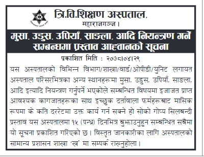 गृहपृष्ठ ∕ समाचार ∕ मुसा, उडुस मार्न त्रि.वि. शिक्षण अस्पतालले खोल्यो बोलपत्र मुसा, उडुस मार्न त्रि.वि. शिक्षण अस्पतालले खोल्यो बोलपत्र हेल्थ आवाज शुक्रबार, २०७८ साउन २९ गते, १५:३६ मा प्रकाशित काठमाडौँ – त्रिभुवन शिक्षण अस्पताल महाराजगन्जले मुसा, साङ्ला र उडुस नियन्त्रण गर्न टेन्डर आह्वान गरेको छ । शुक्रबार अस्पतालले सूचना जारी गरी मुसा, साङ्ला, उडुस, उपियाँले सताएकोले मार्न सक्ने इच्छुकले कति रकम लिने हो खुलाइ गोप्य सिलबन्दी पेस गर्न टेन्डर आह्वान गरेको हो । परिसरभित्रका विभिन्न विभाग, शाखा, वार्ड, ओपिडी लगायत स्थानमा मुसा, साङ्ला, उडुस, उपियाँ मार्न सम्बन्धित विषयमा इजाजत प्राप्त आवश्यक कागजातहरू सहित इच्छुकले १५ दिन भित्र पेस गर्नुपर्ने बताइएको छ। क्याटेगोरी : समाचार तपाईको प्रतिक्रिया दिनुहोस सम्बन्धित समाचार निःशुल्क वितरण गरिने औषधि स्वदेशमै उत्पादन गर्नेबारे छलफल सुदूरपश्चिममा १०० शय्याका ६ निजी अस्पताल, २ निजी अस्पताल स्वीकृतीका… स्वास्थ्य क्षेत्र सुधारका लागि दुई वर्षअघि रास्वपाले बुझाएको २६ बुँदे… शहीद दशरथ चन्द स्वास्थ्य विज्ञान विश्वविद्यालयको सिनेट बैठक पहिलो पटक… हेलो सरकारबाट प्राप्त गुनासो सम्बोधनका लागि फोकल पर्सन तोक्न ४६… भरतपुर अस्पतालको मेसुमा डा. विश्वबन्धु बगाले नियुक्त धेरै पढिएका १ नेपाल हियरिङ एण्ड स्पीच क्लिनिकमार्फत ४० वर्षीय पुरुषोत्तम भुर्तेलको व्यवसायिक उडान २ सरकारी जागिरे डा. रोशन पिजीका इन्ट्रान्स टपर ३ गर्भपतन गर्दा के कुरामा ध्यान दिने ? गर्भपतनपछि आउन सक्छन् यस्ता जटिलता ४ रोबोटिक सर्जरी क्यान्सर उपचारको नयाँ विकल्प : विज्ञ ५ ३८ वर्षीया निशा मेहता स्वास्थ्य तथा जनसंख्यामन्त्री नियुक्त ६ एएमएसपी सम्बन्धि दुई दिने कार्यशाला गोष्ठी सम्पन्न ७ ३८ वर्षीया निशा मेहता स्वास्थ्य तथा जनसंख्यामन्त्री बन्दै TFN ट्रेण्डिङ नेपाल हियरिङ एण्ड स्पीच क्लिनिकमार्फत ४० वर्षीय पुरुषोत्तम भुर्तेलको व्यवसायिक उडान छोरीको साहसले बुवालाई दियो नयाँ जीवन कार्यालय समयमा अनुपस्थित रहने कर्मचारीलाई तह लगाउन वीर अस्पताल व्यवस्थापनका एक दर्जन बढी निर्णय हेलो सरकारबाट प्राप्त गुनासो सम्बोधनका लागि फोकल पर्सन तोक्न ४६ निकायलाई स्वास्थ्य मन्त्रालयको परिपत्र शहीद दशरथ चन्द स्वास्थ्य विज्ञान विश्वविद्यालयको सिनेट बैठक पहिलो पटक गेटामा बस्ने स्वास्थ्य क्षेत्र सुधारका लागि दुई वर्षअघि रास्वपाले बुझाएको २६ बुँदे अवधारणा : सरकारलाई कार्यान्वय गर्ने अवसर भरतपुर अस्पतालको मेसुमा डा. विश्वबन्धु बगाले नियुक्त एएमएसपी सम्बन्धि दुई दिने कार्यशाला गोष्ठी सम्पन्न नेपाल हियरिङ एण्ड स्पीच क्लिनिकमार्फत ४० वर्षीय पु