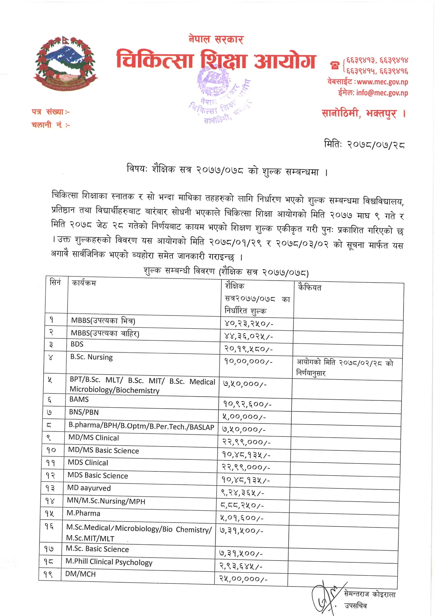 विश्वविद्यालय, कलेज र प्रतिष्ठानबाट शैक्षिक सत्र २०७७/०७८ को शुल्कबारे बारम्बार सोधिएको भन्दैं आयोगले आइतबार शुल्क सूची पुनः सार्वजनिक गरेको हो । जसअनुसार एमबीबीएसको उपत्यकाबाहिर ४४ लाख ३६ हजार २५ रुपैयाँ, एमबीबीएसको उपत्यकाभित्र ४० लाख २३ हजार २ सय ५० रुपैयाँ रहेको छ । यस्तै, बिडिएसतर्फको २० लाख १९ हजार ५ सय ८० रुपैयाँ रहेको छ । बिएएमएसको १० लाख ९२ हजार ६ सय शुल्क निर्धारण गरिएको छ ।