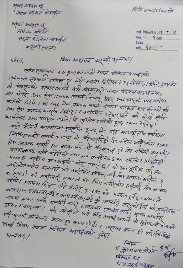 गृहपृष्ठ ∕ समाचार ∕ काउन्सिलको डाटा दुरुपयोग आरोपबारे छानविन गर्न माग काउन्सिलको डाटा दुरुपयोग आरोपबारे छानविन गर्न माग हेल्थ आवाज मंगलबार, २०७८ मंसीर ७ गते, १४:४६ मा प्रकाशित काठमाडौं—नेपाल मेडिकल काउन्सिलको निर्वाचनका क्रममा चिकित्सकका टेलिफोनलगायका डाटा दुरुपयोग आरोपबारे छानविन गर्न उम्मेदवारले माग गरेका छन् । निर्वाचनमा काउन्सिलको सदस्यको उम्मेदवार रहेका डा. कुम्भराज जोशीले उक्त आरोपबारे छानविन गरेर सत्यतथ्य बाहिर ल्याउन आग्रह गरेका छन् । मंगलबार डा. जोशीले नेपाल मेडिकल काउन्सिलले गठन गरेको निर्वाचन समितिका अध्यक्षका नाममा पत्र लेख्दैं काठमाडौंमा १० र ११ गते काउन्सिलको निर्वाचन तोकिएकाले सो समयअगावै छानविन गरी दोषीमाथि कारवाही गर्न माग गरेका छन् । उनले यदि समयमा छानविन अगाडि बढाएर सत्यतथ्य बाहिर नल्याएमा आफू निर्वाचन प्रक्रियाबाट अलग हुने जानकारी अध्यक्षलाई गराएका छन् । यसअघि नेपाल मेडिकल काउन्सिलको निर्वाचनमा उम्मेदवार रहेका केही उम्मेदवारले चिकित्सकको टेलिफोनलगायतका डाटाहरु दुरुपयोग गरेको आरोपसहितका समाचार प्रकाशमा आएका थिए । क्याटेगोरी : समाचार तपाईको प्रतिक्रिया दिनुहोस सम्बन्धित समाचार स्वास्थ्य सेवा पारदर्शी, प्रविधिमैत्री र नागरिमुखी बनाउन डा. श्रीकृष्ण श्रेष्ठको… स्वास्थ्य मन्त्रालयद्वारा दशौं र नवौं तहका २८ जना विशेषज्ञ चिकित्सकसहित… २३ चैतदेखि सरकारी कार्यालय र शैक्षिक संस्थामा दुई दिने बिदा… नेपाल आयुर्वेद चिकित्सक संघको अध्यक्षमा डा. शंकर र महासचिवमा डा.… फार्मेसी सुधारका लागि वीर अस्पतालको ११ बुँदे निर्देशनः बिरामीलाई मुस्कानसहितको… निःशुल्क वितरण गरिने औषधि स्वदेशमै उत्पादन गर्नेबारे छलफल धेरै पढिएका १ नेपाल हियरिङ एण्ड स्पीच क्लिनिकमार्फत ४० वर्षीय पुरुषोत्तम भुर्तेलको व्यवसायिक उडान २ एएमएसपी सम्बन्धि दुई दिने कार्यशाला गोष्ठी सम्पन्न ३ सरकारी जागिरे डा. रोशन पिजीका इन्ट्रान्स टपर ४ हुम्लाका डा. उमाकान्त तिवारीलाई हेल्थ अवार्ड ५ रोबोटिक सर्जरी क्यान्सर उपचारको नयाँ विकल्प : विज्ञ ६ कार्यालय समयमा अनुपस्थित रहने कर्मचारीलाई तह लगाउन वीर अस्पताल व्यवस्थापनका एक दर्जन बढी निर्णय ७ ४ अर्ब लगानीमा बनेको ३०० शय्याको सन्जीवनी टिचिङ हस्पिटल माघ मसान्तबाट सञ्चालनमा आउने TFN ट्रेण्डिङ स्वास्थ्य सेवा पारदर्शी, प्रविधिमैत्री र नागरिमुखी बनाउन डा. श्रीकृष्ण श्रेष्ठको संयोजकत्वमा समिति गठन नेपाल आयुर्वेद चिकित्सक संघको अध्यक्षमा डा. शंकर र महासचिवमा डा. ऋषिकेशव निर्वाचित निःशुल्क वितरण गरिने औषधि स्वदेशमै उत्पादन गर्नेबारे छलफल एएमएसपी सम्बन्धि दुई दिने कार्यशाला गोष्ठी सम्पन्न फार