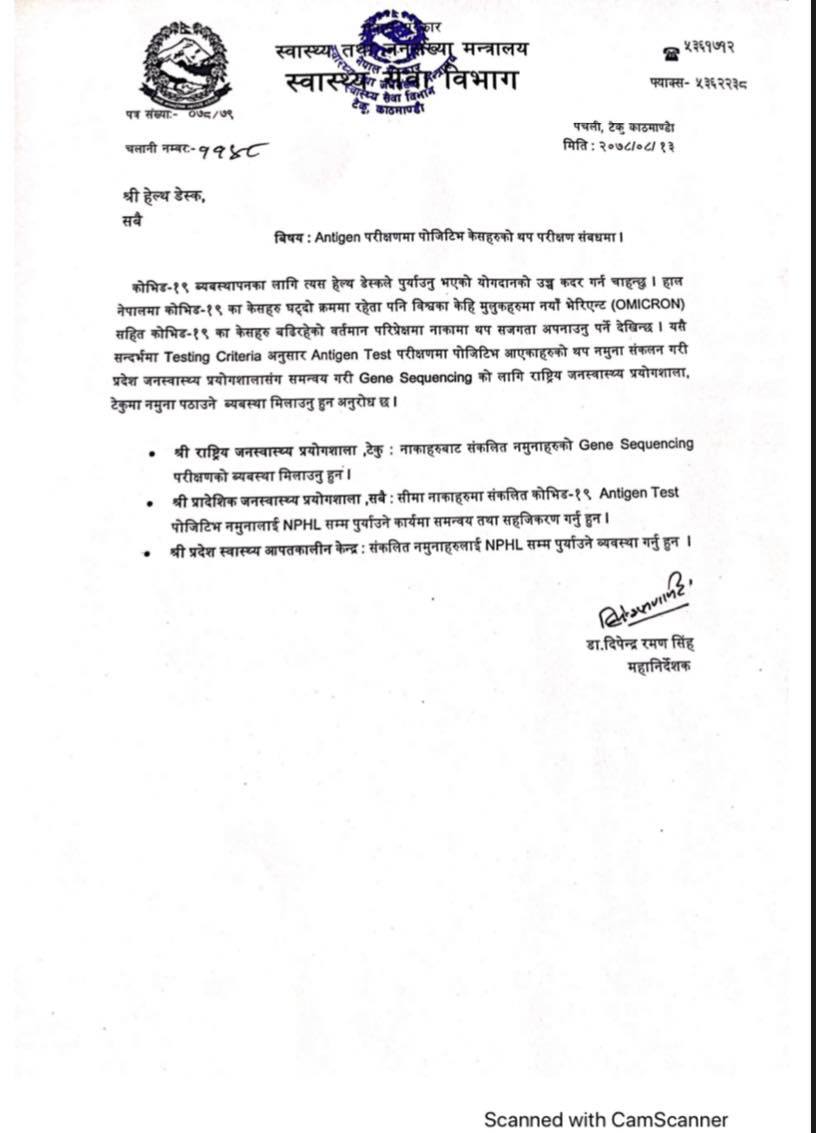 गृहपृष्ठ ∕ समाचार ∕ एन्टीजेन परीक्षणमा पोजिटिभ आएका नमुना प्रयोगशालामा पठाउन स्वास्थ विभागको निर्देशन एन्टीजेन परीक्षणमा पोजिटिभ आएका नमुना प्रयोगशालामा पठाउन स्वास्थ विभागको निर्देशन हेल्थ आवाज सोमबार, २०७८ मंसीर १३ गते, १७:१८ मा प्रकाशित काठमाडौं- स्वास्थ्य सेवा विभागले एन्टीजेन परीक्षणमा पोजिटिभ आएका नमुना जीन सिक्वेन्सिङका लागि राष्ट्रिय जनस्वास्थ्य प्रयोगशालामा पठाउन निर्देशन दिएको छ। सोमबार विभागले सूचना जारी गर्दै विमानस्थल र नाकामा एन्टीजेन परीक्षण पोजिटिभ आएका नमुनाको जीन सिक्वेन्सिङका लागि राष्ट्रिय जनस्वास्थ्य प्रयोगशाला टेकुमा पठाउन निर्देशन दिएको हो। विभागका अनुसार पछिल्लो समय कोभिडको नयाँ भेरियन्ट ओमीक्रोन पुष्टि भैरहेकोले एन्टीजेन परीक्षणमा पोजिटिभ आएका नमुना संकलन गरी जीन सिक्वेन्सिङका लागि प्रयोगशालामा पठाउन लागिएको हो। स्वास्थ्य प्रयोगशालालाई सीमा नाकामा संकलित एन्टीजेन परीक्षण पोजिटिभ नमुना राष्ट्रिय जनस्वास्थ्य प्रयोगशाला पु¥याउने कार्यमा सहजीकरण गर्न अनुरोध समेत गरेको छ। क्याटेगोरी : समाचार तपाईको प्रतिक्रिया दिनुहोस सम्बन्धित समाचार स्वास्थ्य सेवा पारदर्शी, प्रविधिमैत्री र नागरिमुखी बनाउन डा. श्रीकृष्ण श्रेष्ठको… स्वास्थ्य मन्त्रालयद्वारा दशौं र नवौं तहका २८ जना विशेषज्ञ चिकित्सकसहित… २३ चैतदेखि सरकारी कार्यालय र शैक्षिक संस्थामा दुई दिने बिदा… नेपाल आयुर्वेद चिकित्सक संघको अध्यक्षमा डा. शंकर र महासचिवमा डा.… फार्मेसी सुधारका लागि वीर अस्पतालको ११ बुँदे निर्देशनः बिरामीलाई मुस्कानसहितको… निःशुल्क वितरण गरिने औषधि स्वदेशमै उत्पादन गर्नेबारे छलफल धेरै पढिएका १ नेपाल हियरिङ एण्ड स्पीच क्लिनिकमार्फत ४० वर्षीय पुरुषोत्तम भुर्तेलको व्यवसायिक उडान २ एएमएसपी सम्बन्धि दुई दिने कार्यशाला गोष्ठी सम्पन्न ३ सरकारी जागिरे डा. रोशन पिजीका इन्ट्रान्स टपर ४ हुम्लाका डा. उमाकान्त तिवारीलाई हेल्थ अवार्ड ५ रोबोटिक सर्जरी क्यान्सर उपचारको नयाँ विकल्प : विज्ञ ६ ४ अर्ब लगानीमा बनेको ३०० शय्याको सन्जीवनी टिचिङ हस्पिटल माघ मसान्तबाट सञ्चालनमा आउने ७ कार्यालय समयमा अनुपस्थित रहने कर्मचारीलाई तह लगाउन वीर अस्पताल व्यवस्थापनका एक दर्जन बढी निर्णय TFN ट्रेण्डिङ स्वास्थ्य सेवा पारदर्शी, प्रविधिमैत्री र नागरिमुखी बनाउन डा. श्रीकृष्ण श्रेष्ठको संयोजकत्वमा समिति गठन नेपाल आयुर्वेद चिकित्सक संघको अध्यक्षमा डा. शंकर र महासचिवमा डा. ऋषिकेशव निर्वाचित निःशुल्क वितरण गरिने औषधि स्वदेशमै उत्पादन गर्नेबारे छलफल एएमएसपी सम्बन्धि दुई दिने कार्यशाला गोष्ठी सम्पन्न प्रेमसागर कर्माचार्य गरे १८५ औं पटक र