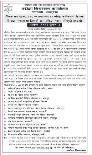 सोहीअनुसार परिषद्ले बुधबार सूचना नै जारी गरेर मोरङस्थित नोबेल मेडिकल कलेज टिचिङ हस्पिटल प्रा.लि., पर्सास्थित नेशनल मेडिकल कलेज, ललिपुरस्थित बीएण्डबी नर्सिङ कलेज, चितवनस्थित नारायणी सामुदायिक हस्पिटल, चितवनस्थित कलेज अफ मेडिकल साइन्सेज, ललिपुरस्थित अल्का इन्स्टिच्युट अफ मेडिकल साइन्स, काठमाडौंस्थित नेपाली सेना स्वास्थ्य विज्ञान संस्थान, काठमाडौंस्थित मोडल हस्पिटल स्कुल अफ नर्सिङ, ललितपुरस्थित मनमोहन मेमोरियल इन्स्टिच्युट अफ हेल्थ साइन्स, काठमाडौस्थित ओम हेल्थ क्याम्पस, कास्कीस्थित मणिपाल मेडिकल कलेज, पाल्पास्थित लुम्बिनी मेडिकल कलेज शिक्षण अस्पताल, रुपन्देहीस्थित देवदह मेडिकल कलेज, बाँकेस्थित नेपालगन्ज नर्सिङ क्याम्पस रहेका छन् ।