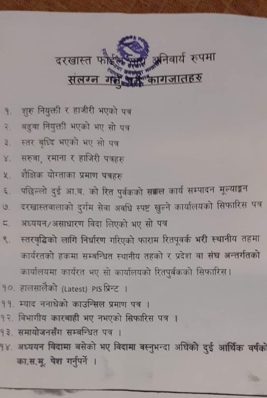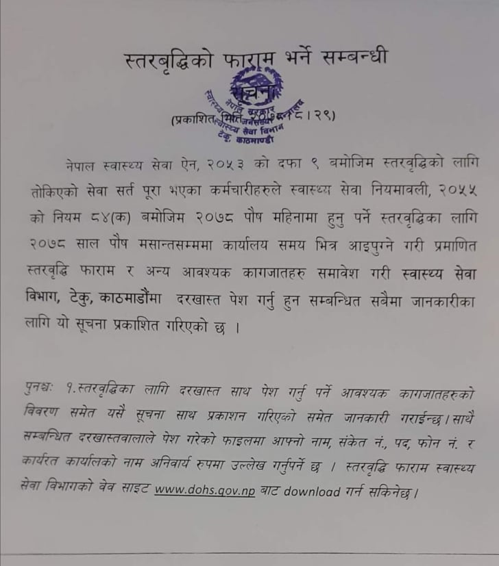 गृहपृष्ठ ∕ समाचार ∕ स्वास्थ्यका कर्मचारीको स्तरवृद्धिका लागि आवेदन माग, के-के चाहिन्छ कागजात ? (सूची सहित्) स्वास्थ्यका कर्मचारीको स्तरवृद्धिका लागि आवेदन माग, के-के चाहिन्छ कागजात ? (सूची सहित्) हेल्थ आवाज मंगलबार, २०७८ पुस ६ गते, १३:१४ मा प्रकाशित काठमाडौँ – स्वास्थ्य सेवा विभागले स्तरवृद्धि हुन योग्यता पुगेका कर्मचारीहरुलाई आवेदन पेस गर्न सूचना सार्वजनिक गरेको छ। यसअघि विभागले स्तरवृद्धिको जिम्मेवारी प्रदेशलाई दिने प्रस्ताव स्वास्थ्य तथा जनसंख्या मन्त्रालयमा पठाएका कारण केहि समय देखि स्तरवृद्धिको आवेदनमा रोक लगाएको थियो। स्वास्थ्य मन्त्रालयले तत्काललाई विभागबाटै स्तरवृद्धि गर्ने र प्रदेशलाई जिम्मा दिने विषयमा सामान्य प्रशासन मन्त्रालयको राय लिने निर्णय गरेको थियो। सोही निर्णय बमोजिम चौथो तह देखि छैठौं तहका स्वास्थ्यतर्फका कर्मचारीको स्तरवृद्धि विभागबाटै हुने भएको हो। विभागका अनुसार कर्मचारीहरुले पौष मसान्तसम्म आवेदन पेस गर्न सक्नेछन् । क्याटेगोरी : समाचार तपाईको प्रतिक्रिया दिनुहोस सम्बन्धित समाचार स्वास्थ्य सेवा पारदर्शी, प्रविधिमैत्री र नागरिमुखी बनाउन डा. श्रीकृष्ण श्रेष्ठको… स्वास्थ्य मन्त्रालयद्वारा दशौं र नवौं तहका २८ जना विशेषज्ञ चिकित्सकसहित… २३ चैतदेखि सरकारी कार्यालय र शैक्षिक संस्थामा दुई दिने बिदा… नेपाल आयुर्वेद चिकित्सक संघको अध्यक्षमा डा. शंकर र महासचिवमा डा.… फार्मेसी सुधारका लागि वीर अस्पतालको ११ बुँदे निर्देशनः बिरामीलाई मुस्कानसहितको… निःशुल्क वितरण गरिने औषधि स्वदेशमै उत्पादन गर्नेबारे छलफल धेरै पढिएका १ नेपाल हियरिङ एण्ड स्पीच क्लिनिकमार्फत ४० वर्षीय पुरुषोत्तम भुर्तेलको व्यवसायिक उडान २ एएमएसपी सम्बन्धि दुई दिने कार्यशाला गोष्ठी सम्पन्न ३ सरकारी जागिरे डा. रोशन पिजीका इन्ट्रान्स टपर ४ हुम्लाका डा. उमाकान्त तिवारीलाई हेल्थ अवार्ड ५ रोबोटिक सर्जरी क्यान्सर उपचारको नयाँ विकल्प : विज्ञ ६ ४ अर्ब लगानीमा बनेको ३०० शय्याको सन्जीवनी टिचिङ हस्पिटल माघ मसान्तबाट सञ्चालनमा आउने ७ कार्यालय समयमा अनुपस्थित रहने कर्मचारीलाई तह लगाउन वीर अस्पताल व्यवस्थापनका एक दर्जन बढी निर्णय TFN ट्रेण्डिङ स्वास्थ्य सेवा पारदर्शी, प्रविधिमैत्री र नागरिमुखी बनाउन डा. श्रीकृष्ण श्रेष्ठको संयोजकत्वमा समिति गठन नेपाल आयुर्वेद चिकित्सक संघको अध्यक्षमा डा. शंकर र महासचिवमा डा. ऋषिकेशव निर्वाचित एएमएसपी सम्बन्धि दुई दिने कार्यशाला गोष्ठी सम्पन्न निःशुल्क वितरण गरिने औषधि स्वदेशमै उत्पादन गर्नेबारे छलफल प्रेमसागर कर्माचार्य गरे १८५ औं पटक रक्तदान फार्मेसी सुधारका लागि वीर अस्पतालको ११ बुँदे निर्देशनः बिर