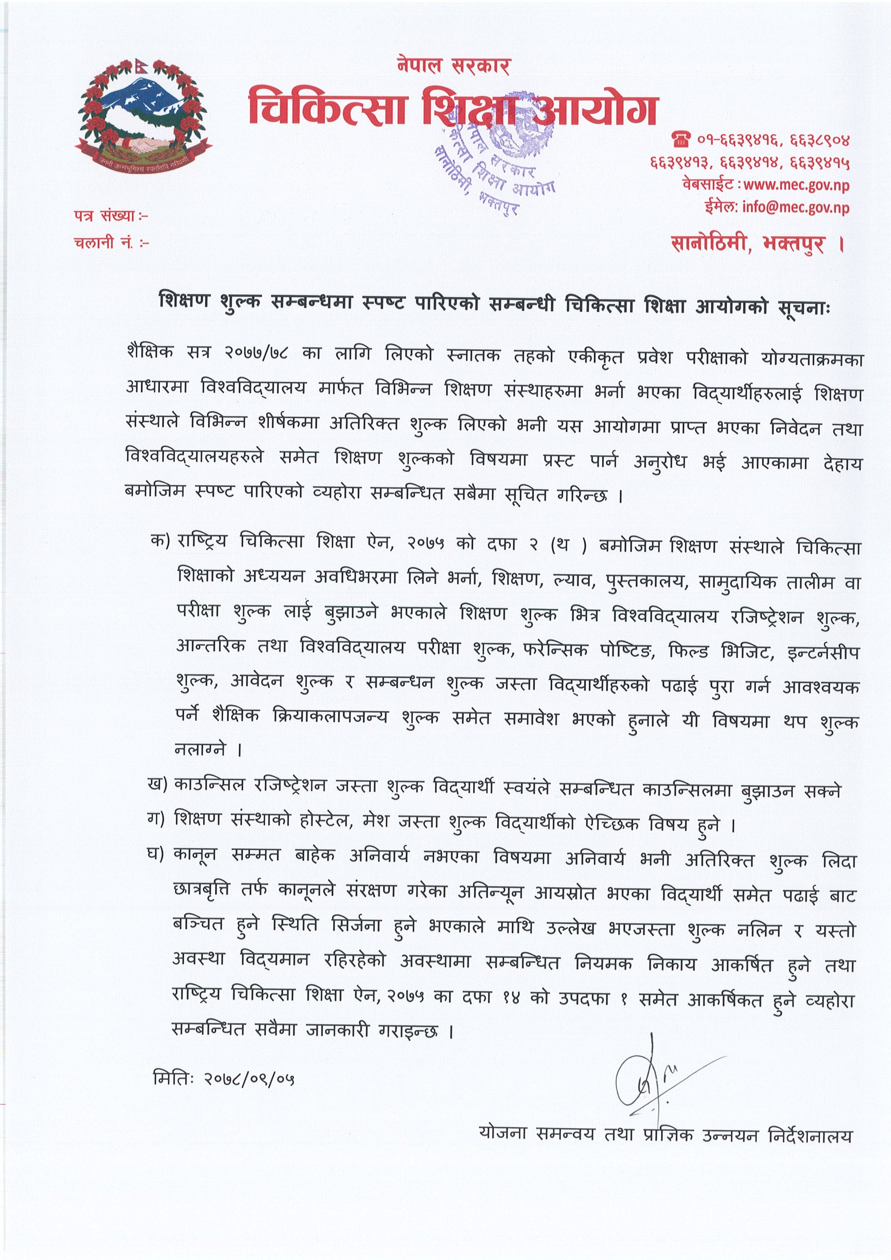 सूचनामा उल्लेख भएजस्ता शीर्षकमा शुल्क लिएमा राष्ट्रिय चिकित्सा शिक्षा ऐन, २०७५ का दफा १४ को उपदफा १ आकर्षिकत हुने जानकारी आयोगले गराएको छ।