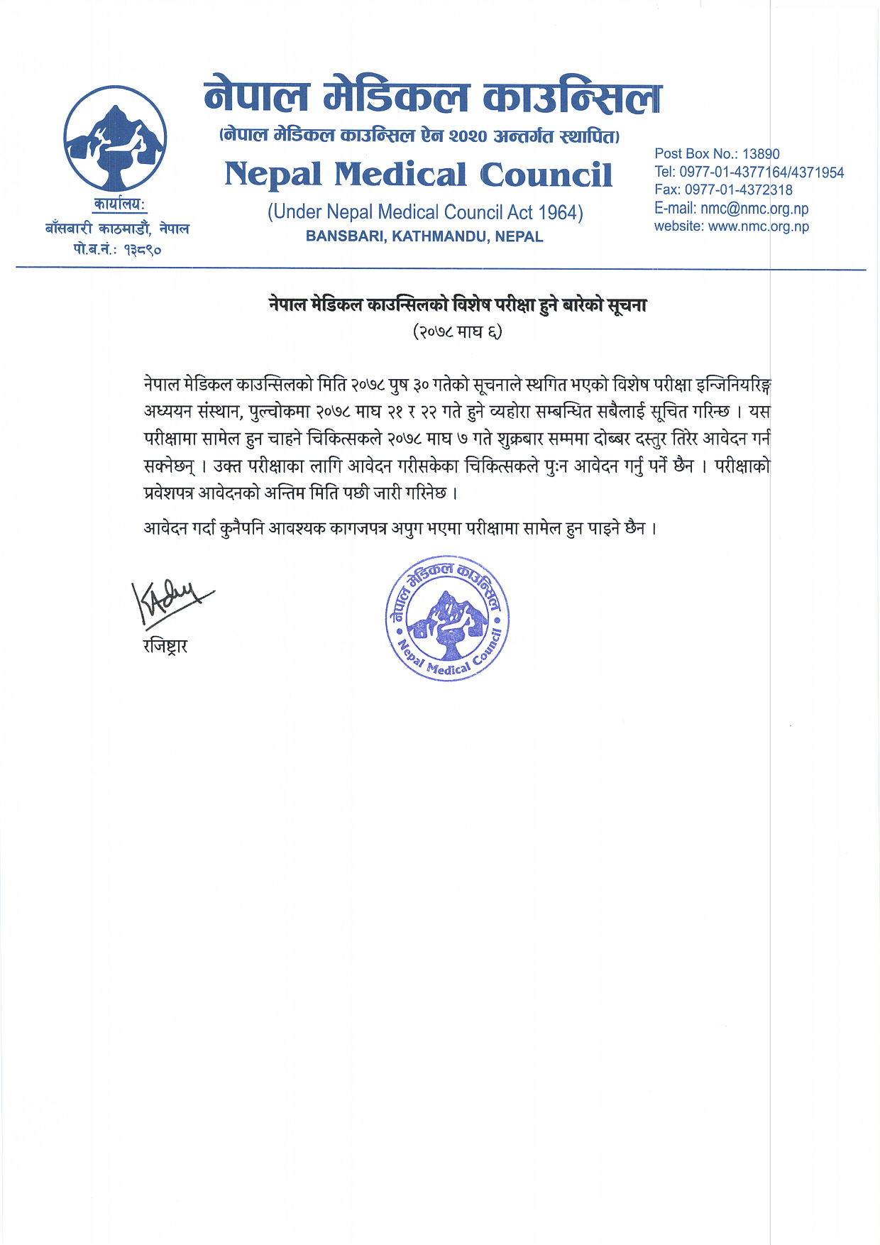 गृहपृष्ठ ∕ समाचार ∕ नेपाल मेडिकल काउन्सिलको विशेष परीक्षा २१ र २२ माघमा हुने नेपाल मेडिकल काउन्सिलको विशेष परीक्षा २१ र २२ माघमा हुने हेल्थ आवाज बिहीबार, २०७८ माघ ६ गते, ११:२९ मा प्रकाशित काठमाडौं—नेपाल मेडिकल काउन्सिलले स्थगित गरेको विशेष परीक्षा २१ र २२ माघमा हुने भएको छ । काउन्सिलले बिहीबार एक सूचना प्रकाशित गर्दै स्थगित विशेष परीक्षा २१ र २२ मा पुल्चोक इन्जिनियरिङ क्याम्पसमा हुने जनाएको छ । ३० पुसमा किाउन्सिलले १४ र १५ माघका लागि तय गरेको विशेष परीक्षा कोभिड—१९ का कारण स्थगित गरेको थियो । परीक्षामा सामेल हुन चाहने चिकित्सक ७ माघसम्म दोब्बर दस्तुर तिरेर आवेदन दिन सक्नेछन् । क्याटेगोरी : समाचार तपाईको प्रतिक्रिया दिनुहोस सम्बन्धित समाचार नेपाल आयुर्वेद चिकित्सक संघको अध्यक्षमा डा. शंकर र महासचिवमा डा.… फार्मेसी सुधारका लागि वीर अस्पतालको ११ बुँदे निर्देशनः बिरामीलाई मुस्कानसहितको… निःशुल्क वितरण गरिने औषधि स्वदेशमै उत्पादन गर्नेबारे छलफल सुदूरपश्चिममा १०० शय्याका ६ निजी अस्पताल, २ निजी अस्पताल स्वीकृतीका… स्वास्थ्य क्षेत्र सुधारका लागि दुई वर्षअघि रास्वपाले बुझाएको २६ बुँदे… शहीद दशरथ चन्द स्वास्थ्य विज्ञान विश्वविद्यालयको सिनेट बैठक पहिलो पटक… धेरै पढिएका १ नेपाल हियरिङ एण्ड स्पीच क्लिनिकमार्फत ४० वर्षीय पुरुषोत्तम भुर्तेलको व्यवसायिक उडान २ एएमएसपी सम्बन्धि दुई दिने कार्यशाला गोष्ठी सम्पन्न ३ सरकारी जागिरे डा. रोशन पिजीका इन्ट्रान्स टपर ४ रोबोटिक सर्जरी क्यान्सर उपचारको नयाँ विकल्प : विज्ञ ५ डा. जितप्रकाश श्रेष्ठः सरकमसिजन के हो ? यो किन गरिन्छ ? ६ हुम्लाका डा. उमाकान्त तिवारीलाई हेल्थ अवार्ड ७ गर्भनिरोधक चक्की प्रयोग गर्दा यी कुरामा दिनुहोस् ध्यान TFN ट्रेण्डिङ नेपाल हियरिङ एण्ड स्पीच क्लिनिकमार्फत ४० वर्षीय पुरुषोत्तम भुर्तेलको व्यवसायिक उडान एएमएसपी सम्बन्धि दुई दिने कार्यशाला गोष्ठी सम्पन्न फार्मेसी सुधारका लागि वीर अस्पतालको ११ बुँदे निर्देशनः बिरामीलाई मुस्कानसहितको सेवादेखि कार्यालय समयमा एमआरलाई निषेधसम्म शहीद दशरथ चन्द स्वास्थ्य विज्ञान विश्वविद्यालयको सिनेट बैठक पहिलो पटक गेटामा बस्ने हेलो सरकारबाट प्राप्त गुनासो सम्बोधनका लागि फोकल पर्सन तोक्न ४६ निकायलाई स्वास्थ्य मन्त्रालयको परिपत्र सरकारी जागिरे डा. रोशन पिजीका इन्ट्रान्स टपर विपी सुधारका लागि १३ बुँदे निर्णयः हाजिरी अनुगमन गर्न प्रा.डा. स्मृति कार्कीको संयोजकत्वमा समिति स्वास्थ्य क्षेत्र सुधारका लागि दुई वर्षअघि रास्वपाले बुझाएको २६ बुँदे अवधारणा : सरकारलाई कार्यान्वय गर्ने अवसर नेपाल हियरिङ एण्ड स्पीच क्लिनिकमार्फत ४० वर्षीय पुरुषो