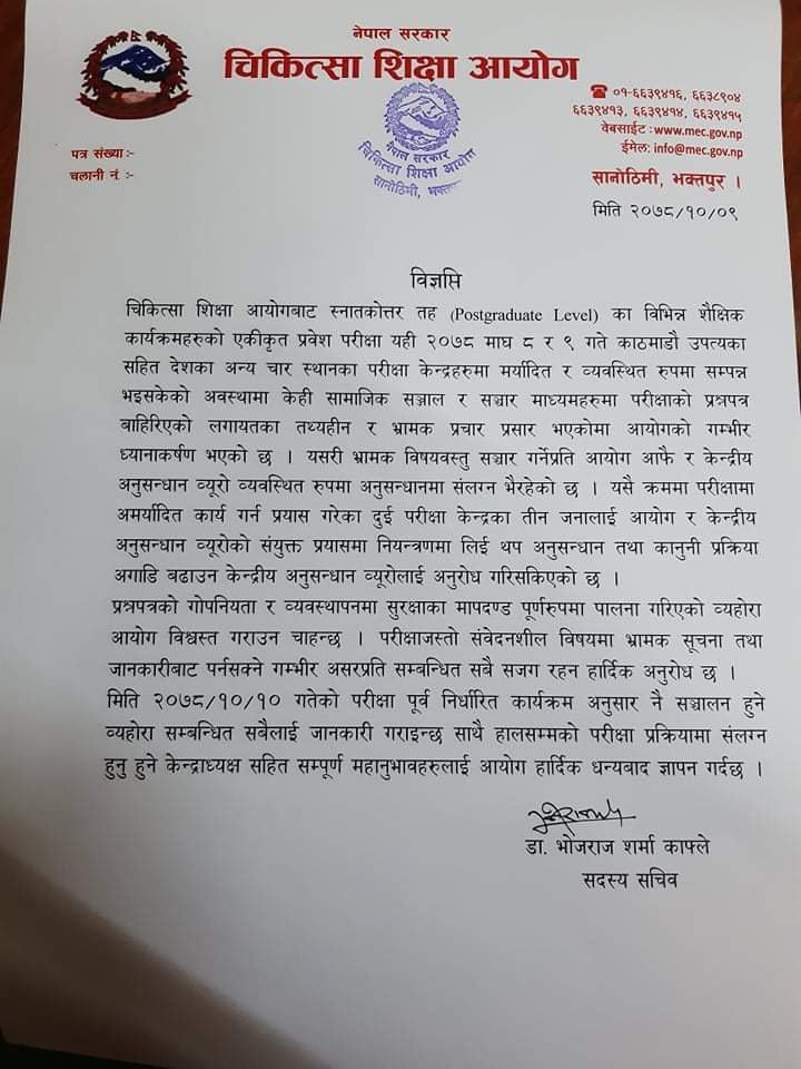 प्रश्नपत्र गाेपनियता र व्यवस्थापनमा सुरक्षा मापदण्ड पुर्णरुपमा पालना गरीएको भन्दै परीक्षा जस्तो संवेदनसिल विषयवस्तुमा भ्रामक सुचना संप्रेसण नगर्न समेत अनुरोध गरेको छ । साथै सोमवार हुने परिक्षा नियमित नै हुने पनि उल्लेख गरेको छ ।