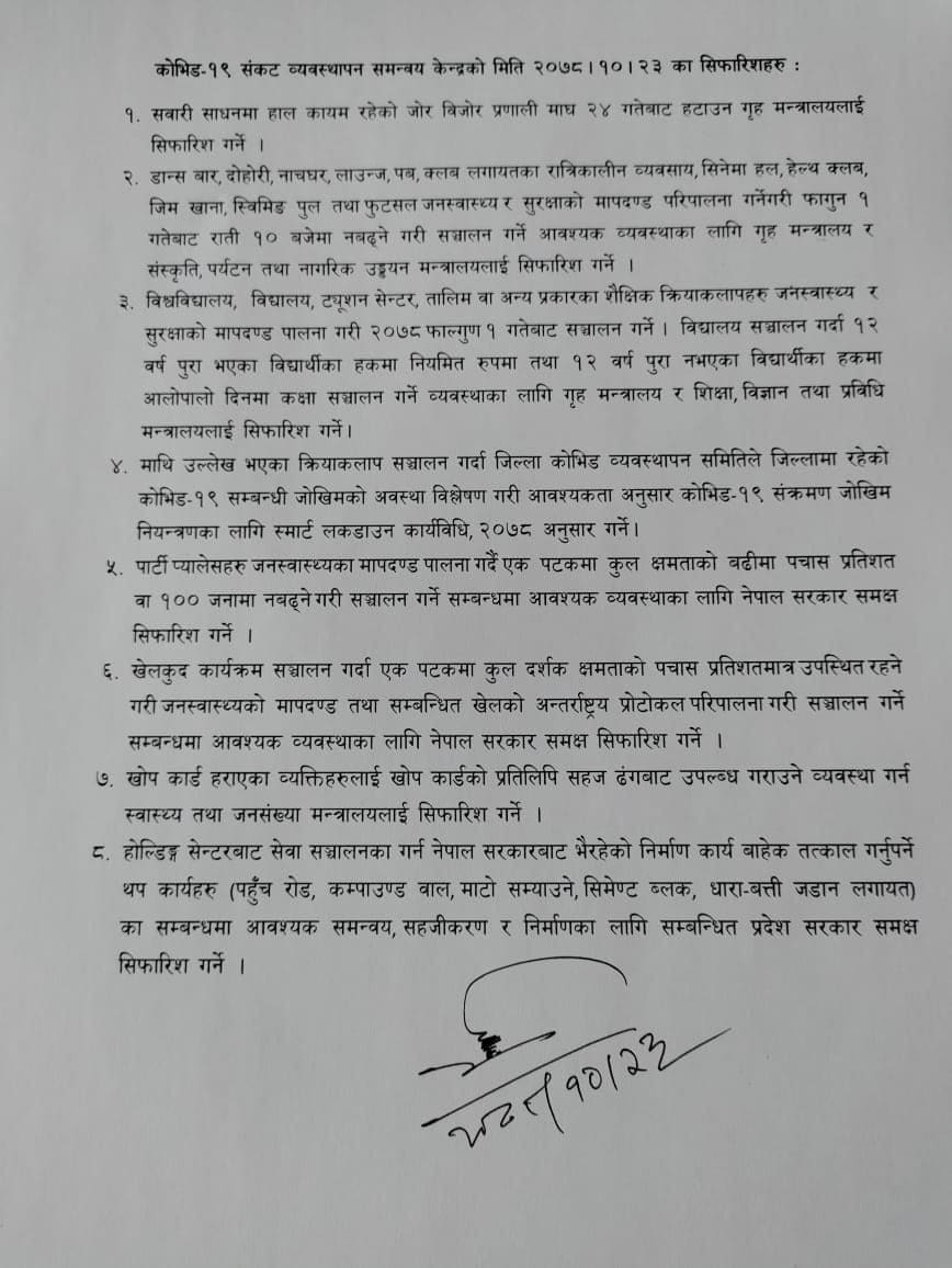 गृहपृष्ठ ∕ समाचार ∕ सीसीएमसीसीका ८ सिफारिस : भोलिबाट जोरबिजोर हटाउने, १ फागुनबाट शैक्षिक संस्था खुल्ने सीसीएमसीसीका ८ सिफारिस : भोलिबाट जोरबिजोर हटाउने, १ फागुनबाट शैक्षिक संस्था खुल्ने हेल्थ आवाज आईतबार, २०७८ माघ २३ गते, १९:१२ मा प्रकाशित काठमाडौं—कोभिड—१९ संकट व्यवस्थापन समन्वय केन्द्र (सीसीएमसीसी)ले जोरबिजोर प्रणाली हटाउन सिफारिस गरेको छ । गृहमन्त्रालयलाई सीसीएमसीसीले गरेको सिफारिसमा २४ गतेबाट सवारी साधनमा हाल कायम रहेको जोर विजोर प्रणाली हटाउने सिफारिस गरिएको हो । त्यसैगरी, फागुन १ गतेदेखि विश्वविद्यालय, विद्यालय र शैक्षिक कार्यक्रम सञ्चालन हुने संस्थाहरु जनस्वास्थ्य र सुरक्षाका मापदण्ड पालना गरी सञ्चालन गर्ने, १२ वर्षमुनिका विद्यार्थीहरुको हकमा आलोपालो दिनमा कक्षा सञ्चालनको व्यवस्था गर्न सिफारिस छ । पार्टी प्यालेसहरुमा एकपटकमा १०० जनाभन्दा नबढ्ने गरी सञ्चालन गर्न सिफारिस गरेको छ । खेलकूदका कार्यक्रमहरुमा ५० प्रतिशत क्षमतामा दर्शक राखेर मात्र सञ्चालन गर्ने सिफारिस गरिएको छ । खोप कार्ड हराएका व्यक्तिहरुमा खोप कार्ड प्रतिलिपी सहज रुपमा उपलब्ध गराउन स्वास्थ्य मन्त्रालयलाई सिफारिस गर्ने निर्णय पनि सीसीएमसीसीको छ । क्याटेगोरी : समाचार तपाईको प्रतिक्रिया दिनुहोस सम्बन्धित समाचार सिंहदरबार सर्दै स्वास्थ्य मन्त्रालय, डब्लूएचओले बनाइदिएका प्रिफ्याबका भवन हस्तान्तरण शहीद दशरथ चन्द स्वास्थ्य विज्ञान विश्वविद्यालयको रजिष्ट्रारका लागि १० जनाको… शहीद धर्मभक्त राष्ट्रिय प्रत्यारोपण केन्द्रको कार्यकारी निर्देशकमा डा. कल्पना ९ वटा औषधी उत्पादन गर्ने तयारीमा नेपाल औषधी लिमिटेड कानुन विपरित काम गर्ने महानिर्देशकलाई बोकेर जेन-जी मन्त्रीको सुशासन यात्रा स्वास्थ्य सेवा विभागको महानिर्देशकमा डा. ढकाल नियुक्त धेरै पढिएका १ अघि बढ्यो सुर्खेत मेडिकल कलेज निर्माण प्रक्रिया २ कानुन विपरित काम गर्ने महानिर्देशकलाई बोकेर जेन-जी मन्त्रीको सुशासन यात्रा ३ एलओडीमा गुन्जिदैंछन् कलेजो प्रत्यारोपण सर्जन प्रा. डा. रमेशसिंह भण्डारी ४ भैरहवामा ‘एडभान्स इन्टरनेशनल हस्पिटल’ बैशाखबाट औपचारिक रुपमा सञ्चालनमा आउने ५ निजी अस्पतालमा ठेक्का प्रथा रोक्ने स्वास्थ्यमन्त्रीको प्रतिबद्धता ६ सिभिल अस्पतालले माग्यो १० औं तहका कन्सल्ट्यान्टदेखि छैटौं तहका अधिकृतसम्मका कर्मचारी ७ भीम अस्पतालको मेसुमा डा. वर्षा थापा नियुक्त Kalpana Craft ट्रेण्डिङ शहीद दशरथ चन्द स्वास्थ्य विज्ञान विश्वविद्यालयको रजिष्ट्रारका लागि १० जनाको आवेदन अर्थको स्वीकृती नपाउँदा सेती प्रादेशिक अस्पताल केन्द्र मातहतमा ल्याउने प्रक्रियामा ढिलाइ स्वास्थ्य सेवा विभागको महा