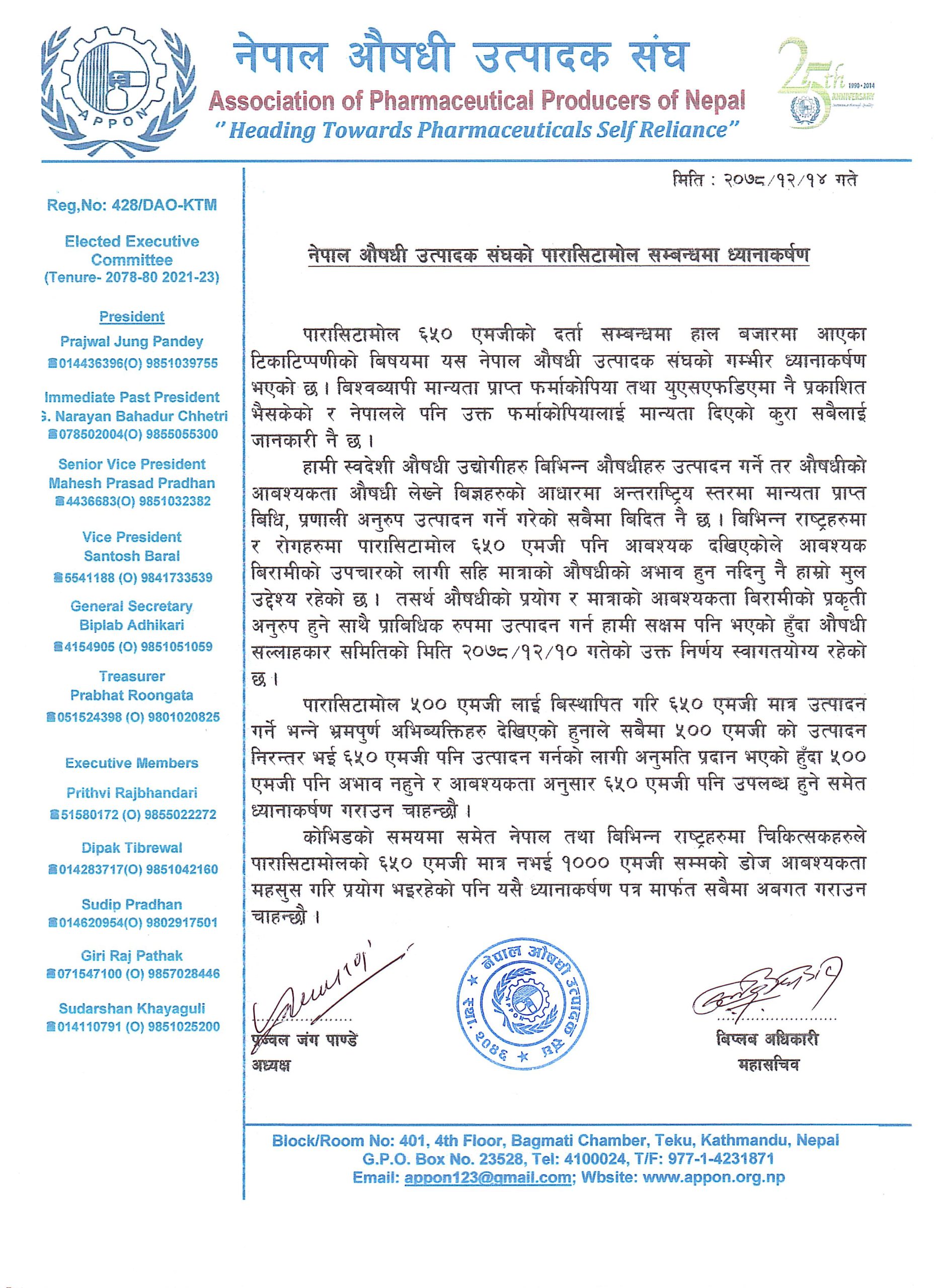 ‘अहिले कतिपयले पारासिटामोल ५०० एमजी लाई बिस्थापित गरि ६५० एमजी मात्र उत्पादन गर्ने भन्ने भ्रमपुर्ण अभिब्यक्तिहरु देखिएको छ । त्यसो होईन, ५०० एमजी को उत्पादन निरन्तर भई ६५० एमजी पनि उत्पादन गर्नको लागी अनुमति प्रदान हो । त्यसैले बजारमा ५०० एमजी पनि अभाव नहुने र आवश्यकता अनुसार ६५० एमजी पनि उपलब्ध हुने छ,’ विज्ञप्तीमा भनिएको छ ।