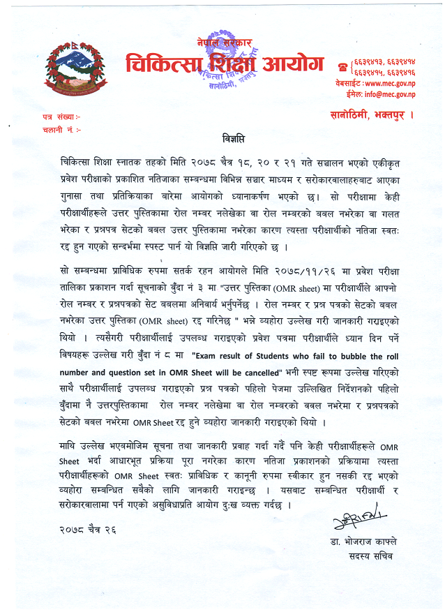 गृहपृष्ठ ∕ समाचार ∕ चिकित्सा शिक्षा आयोगले भन्यो, ‘रोल नम्बर राम्रोसँग नलेखेका विद्यार्थीको परीक्षा रद्ध भएको हो’ चिकित्सा शिक्षा आयोगले भन्यो, ‘रोल नम्बर राम्रोसँग नलेखेका विद्यार्थीको परीक्षा रद्ध भएको हो’ हेल्थ आवाज आईतबार, २०७८ चैत्र २७ गते, १०:४४ मा प्रकाशित काठमाडौं—चिकित्सा शिक्षा आयोगले एकीकृत प्रवेश परीक्षामा रोल नम्बर राम्रोसँग नलेखेका विद्यार्थीहरुको परीक्षा रद्ध भएको जनाएको छ । १६ चैतमा आयोगले विज्ञप्ति प्रकाशित गर्दै रोन नम्बर नलेखेका, रोल नम्बर बबल नभरेका, गलत भरेका र प्रश्नपत्र सेटको बबल उत्तरपुस्तिका नभरेका विद्यार्थीहरुको परीक्षा स्वतः रद्ध भएको जनाएको छ । यसअघि विद्यार्थी परीक्षा दिएको तर नतिजा प्रकाशित नभएको भन्दैं आयोगले निकालेको नतिजाप्रति प्रश्न उठाउँदैं आएका थिए । आयोगको नतिजाप्रति प्रश्न उठेपछि आयोगले विज्ञप्ति नै जारी गरेर स्पष्टीकरण दिएको हो । क्याटेगोरी : समाचार तपाईको प्रतिक्रिया दिनुहोस सम्बन्धित समाचार स्वास्थ्य क्षेत्र सुधारका लागि दुई वर्षअघि रास्वपाले बुझाएको २६ बुँदे… शहीद दशरथ चन्द स्वास्थ्य विज्ञान विश्वविद्यालयको सिनेट बैठक पहिलो पटक… हेलो सरकारबाट प्राप्त गुनासो सम्बोधनका लागि फोकल पर्सन तोक्न ४६… भरतपुर अस्पतालको मेसुमा डा. विश्वबन्धु बगाले नियुक्त कार्यालय समयमा अनुपस्थित रहने कर्मचारीलाई तह लगाउन वीर अस्पताल व्यवस्थापनका… नवौं र दशौं तहका १४ जना विशेषज्ञ चिकित्सकको काज फिर्ता धेरै पढिएका १ नेपाल हियरिङ एण्ड स्पीच क्लिनिकमार्फत ४० वर्षीय पुरुषोत्तम भुर्तेलको व्यवसायिक उडान २ सरकारी जागिरे डा. रोशन पिजीका इन्ट्रान्स टपर ३ गर्भपतन गर्दा के कुरामा ध्यान दिने ? गर्भपतनपछि आउन सक्छन् यस्ता जटिलता ४ रोबोटिक सर्जरी क्यान्सर उपचारको नयाँ विकल्प : विज्ञ ५ ३८ वर्षीया निशा मेहता स्वास्थ्य तथा जनसंख्यामन्त्री नियुक्त ६ एएमएसपी सम्बन्धि दुई दिने कार्यशाला गोष्ठी सम्पन्न ७ ३८ वर्षीया निशा मेहता स्वास्थ्य तथा जनसंख्यामन्त्री बन्दै TFN ट्रेण्डिङ स्वास्थ्य क्षेत्र सुधारका लागि दुई वर्षअघि रास्वपाले बुझाएको २६ बुँदे अवधारणा : सरकारलाई कार्यान्वय गर्ने अवसर कार्यालय समयमा अनुपस्थित रहने कर्मचारीलाई तह लगाउन वीर अस्पताल व्यवस्थापनका एक दर्जन बढी निर्णय नेपाल हियरिङ एण्ड स्पीच क्लिनिकमार्फत ४० वर्षीय पुरुषोत्तम भुर्तेलको व्यवसायिक उडान हेलो सरकारबाट प्राप्त गुनासो सम्बोधनका लागि फोकल पर्सन तोक्न ४६ निकायलाई स्वास्थ्य मन्त्रालयको परिपत्र छोरीको साहसले बुवालाई दियो नयाँ जीवन अर्किडले आमाहरूका लागि विशेष छुटमा फिजियो थेरापी वेलनेस प्याकेज सञ्चालन गर्ने कलेजो खराब हुँदा देखिन