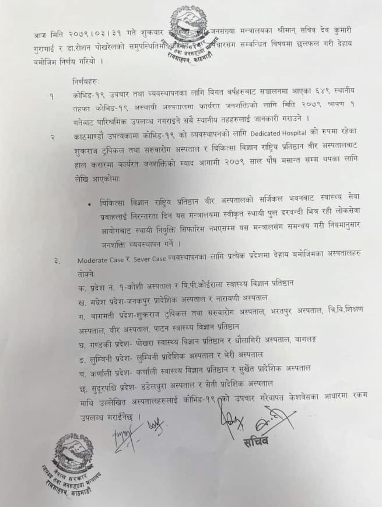 शुक्रबार मन्त्रालयका स्वास्थ्य सचिव डा. रोशन पोखरेल र प्रशासन सचिव देवकुमारी गुरागाईसहितको बैठकले यस्तो निर्णय गरेको हो ।