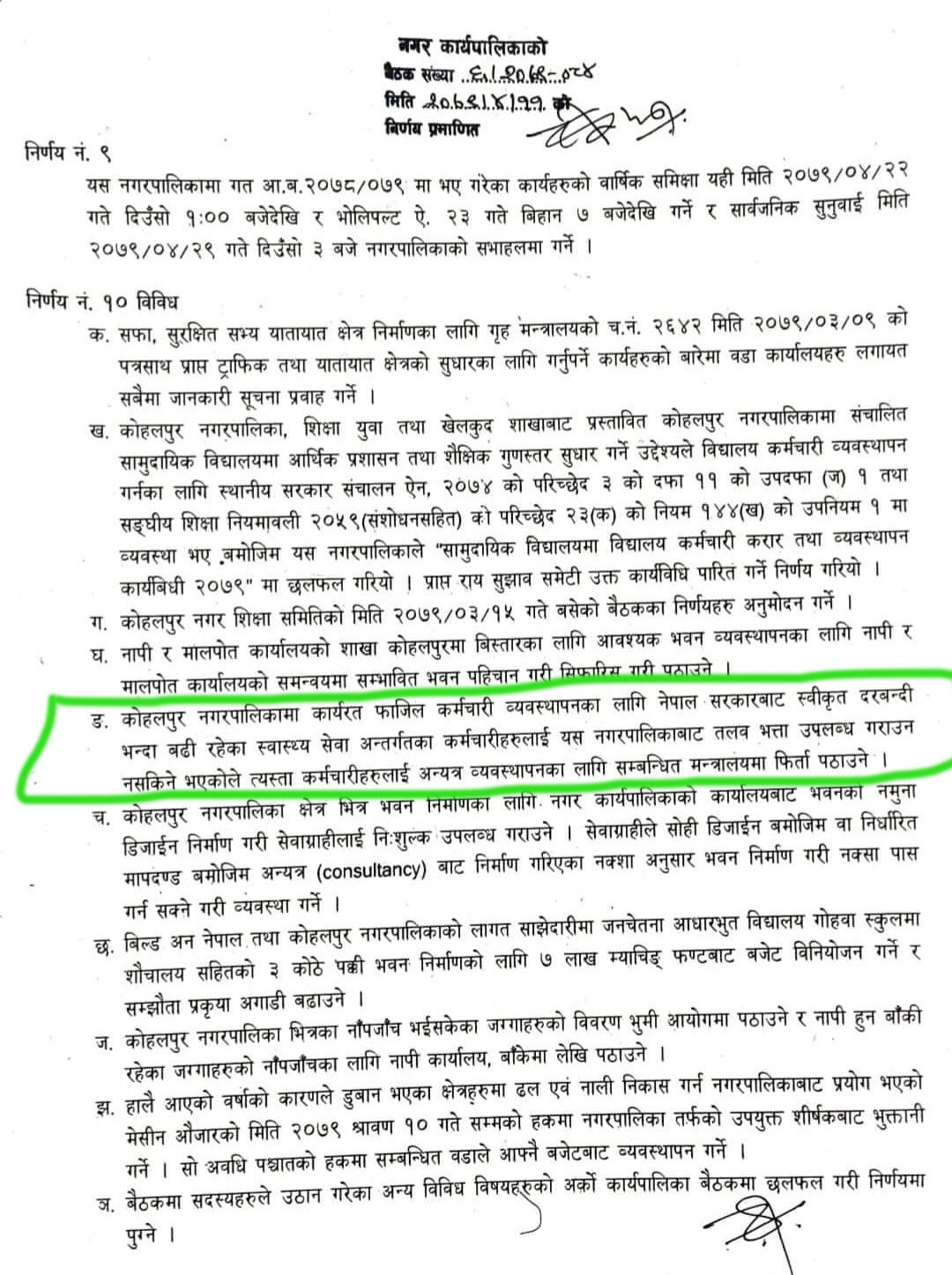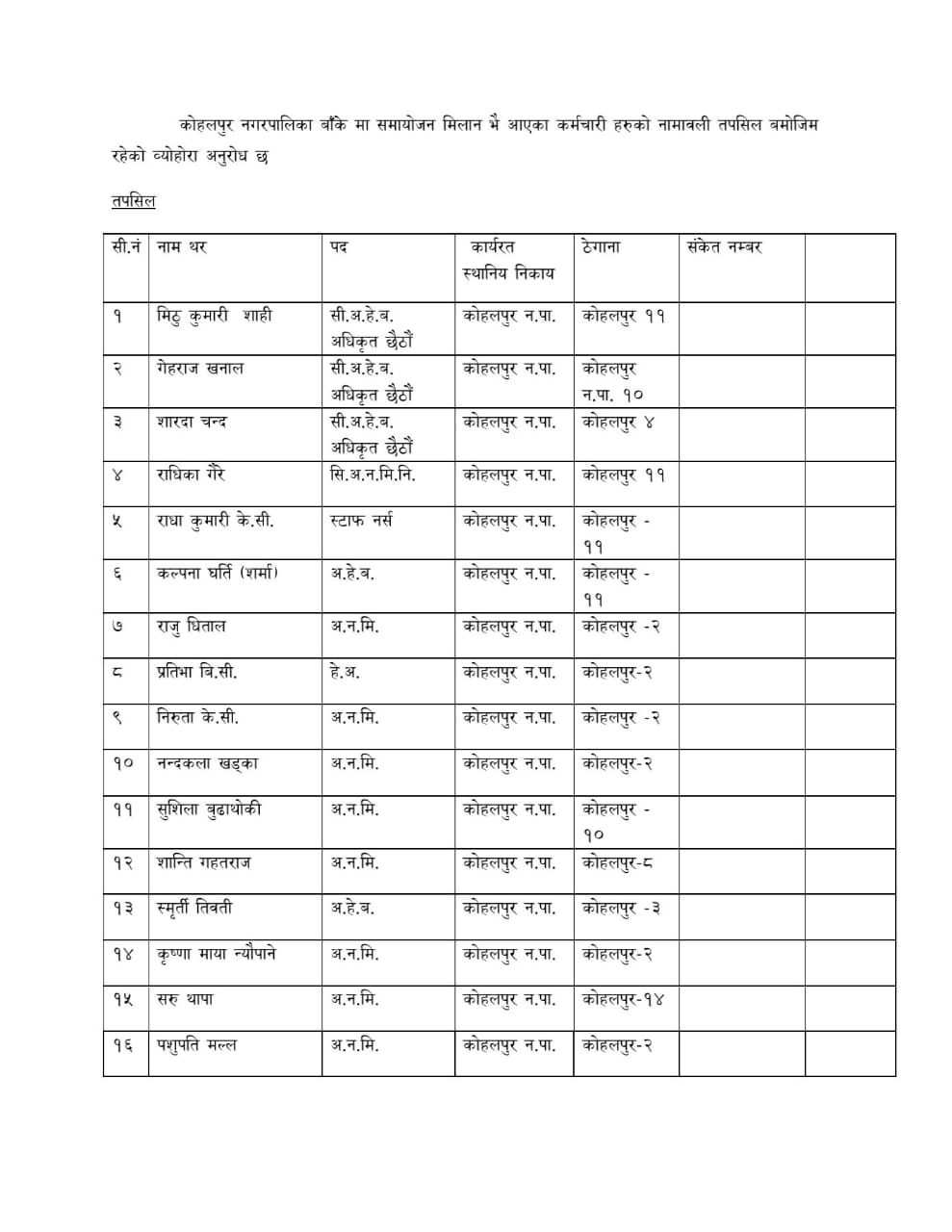 बाँकेको कोहलपुर नगरपालिकाले १६ जना समायोजन मिलान भएर आएका कर्मचारीलाई तलब खुवाउन नसक्ने भन्दै सूची नै स्वास्थ्य तथा जनसंख्या मन्त्रालयमा पठाएको छ । कानुनतः स्थानीय तहमा समायोजन भइसकेका कर्मचारीलाई तलब खुवाउन सकिदैन् भन्न नमिल्ने मन्त्रालयका कानुन उपसचिव रेशराज शर्मा बताउँछन् । ‘समायोजन ऐनलाई नै टेकेर समायोजन मिलान भएको हो,’ उनले भने, ‘त्यहीअनुरुप नै कर्मचारीले काम गर्ने वातावरण हुनुपर्छ ।’