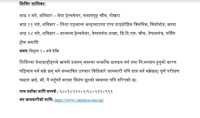 गृहपृष्ठ ∕ समाचार ∕ वात्सल्यले देशको ३ शहरमा स्वास्थ्य शिविर गर्दै वात्सल्यले देशको ३ शहरमा स्वास्थ्य शिविर गर्दै हेल्थ आवाज शुक्रबार, २०७९ भदौ ३ गते, १६:०१ मा प्रकाशित काठमाडौँ – वात्सल्य नेचुरल आईभिएफले देशका प्रमुख ३ शहरमा स्वास्थ्य शिविर आयोजना गर्ने भएको छ। शुक्रबार आईभिएफले प्रेस विज्ञप्ति जारी गर्दै पोखरा, विर्तामोड र नेपालगंजमा एकदिने स्वास्थ्य शिविर आयोजना गर्ने जनाएको हो। वात्सल्यले प्रजनन् उपचारमा काठमाडौँ बाहिरका दम्पतीको पनि पहुँच बढाउन् देशका तीन प्रमुख शहरहरूमा स्वास्थ्य शिविर आयोजना गर्ने भएको हो। उक्त शिविरमा वात्सल्यका वरिष्ठ प्रजनन् तथा स्त्रीरोग विशेषज्ञ डा. आकृति भारतीको संलग्नता रहने बताइएको छ। सेवाग्राहीहरुको प्रजनन् अवस्था सम्बन्धी छलफल, नि:सन्तान हुनुको कारण पहिचान र सम्भावित उपचार विधिबारे जानकारी पनि प्राप्त गराउने शिविरको उद्देश्य रहेको छ। परीक्षणपछि आइभीएफ नै गर्नुपरेको खण्डमा विशेष छुटको पनि वात्सल्यको योजना छ । त्यस्तै, शुक्रबार वात्सल्यले आफ्नो छैठौं वार्षिकोत्सव मनाएको छ । सो अवसरमा क्लिनिकले २५ सय भन्दा बढीलाई सन्तान प्राप्तिको खुसी दिएको जनाएको छ । क्याटेगोरी : समाचार तपाईको प्रतिक्रिया दिनुहोस सम्बन्धित समाचार निजी अस्पतालमा ठेक्का प्रथा रोक्ने स्वास्थ्यमन्त्रीको प्रतिबद्धता जेन-जी प्रदर्शनका घाइतेको वर्गीकरण गरिदैं, प्रमुख जिल्ला अधिकारीको नेतृत्वमा समिति अघि बढ्यो सुर्खेत मेडिकल कलेज निर्माण प्रक्रिया एलओडीमा गुन्जिदैंछन् कलेजो प्रत्यारोपण सर्जन प्रा. डा. रमेशसिंह भण्डारी स्वास्थ्य बीमा बोर्ड, कान्ति, गेटा, डडेल्धुरा र सुशील कोइराला प्रखर… एमबीबीएसको एकीकृत प्रवेश परीक्षामा ८७७२ जना पास धेरै पढिएका १ भैरहवामा ‘एडभान्स इन्टरनेशनल हस्पिटल’ बैशाखबाट औपचारिक रुपमा सञ्चालनमा आउने २ स्वास्थ्य सेवा विभागद्वारा १५ करोडको आइरन चक्की र फोलिक एसिड खरिदको ठेक्का रद्ध ३ लाखौंका इम्प्लान्टमा बेथितीः नियमनको दायरामा ल्याउने स्वास्थ्यको तयारी जेन-जी आन्दोलनले खरानी ४ स्वास्थ्य बीमा बोर्ड, कान्ति, गेटा, डडेल्धुरा र सुशील कोइराला प्रखर क्यान्सर अस्पतालका लागि २५६ दरबन्दी स्वीकृत ५ एलओडीमा गुन्जिदैंछन् कलेजो प्रत्यारोपण सर्जन प्रा. डा. रमेशसिंह भण्डारी ६ अघि बढ्यो सुर्खेत मेडिकल कलेज निर्माण प्रक्रिया ७ पशुपति चौलागाई अस्पताल बीमा भुक्तानी नपाउँदा सङ्कटमा Kalpana Craft ट्रेण्डिङ १० अगष्टभित्र कोरोना विरुद्धको खोप बजारमा उपलब्ध गराउने रुसको दावी शरीरका सबै अंगमा फाइदा पुर्याउने सर्वांगासन योग कसरी गर्ने पाचनदेखि तिघ्रा र घुँडासम्म विरासन योग जान्नुहोस् यसको विधि र फाइदा निजी अस्पता