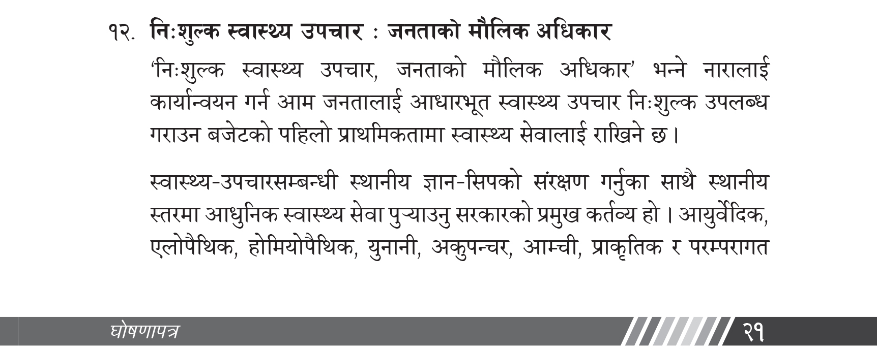 सबै नागरिकलाई स्वास्थ्य बिमामा आबद्ध गर्ने, गरिबीको रेखामुनि रहेका लागि बिमा रकमको ५० प्रतिशत रकम सरकारले भुक्तानी गरिदिने, १५ वर्षमुनिका बालबालिका तथा ६५ वर्षमाथिका ज्येष्ठ नागरिक, अपाङ्गता भएका व्यक्ति, असहाय र विपन्नलाई निःशुल्क परीक्षण र उपचारको स्वास्थ्य सेवा उपलब्ध गराउन पहल गर्नेलगायतका कुरा समाजवादीले घोषणा पत्रमा समेटेको छ ।