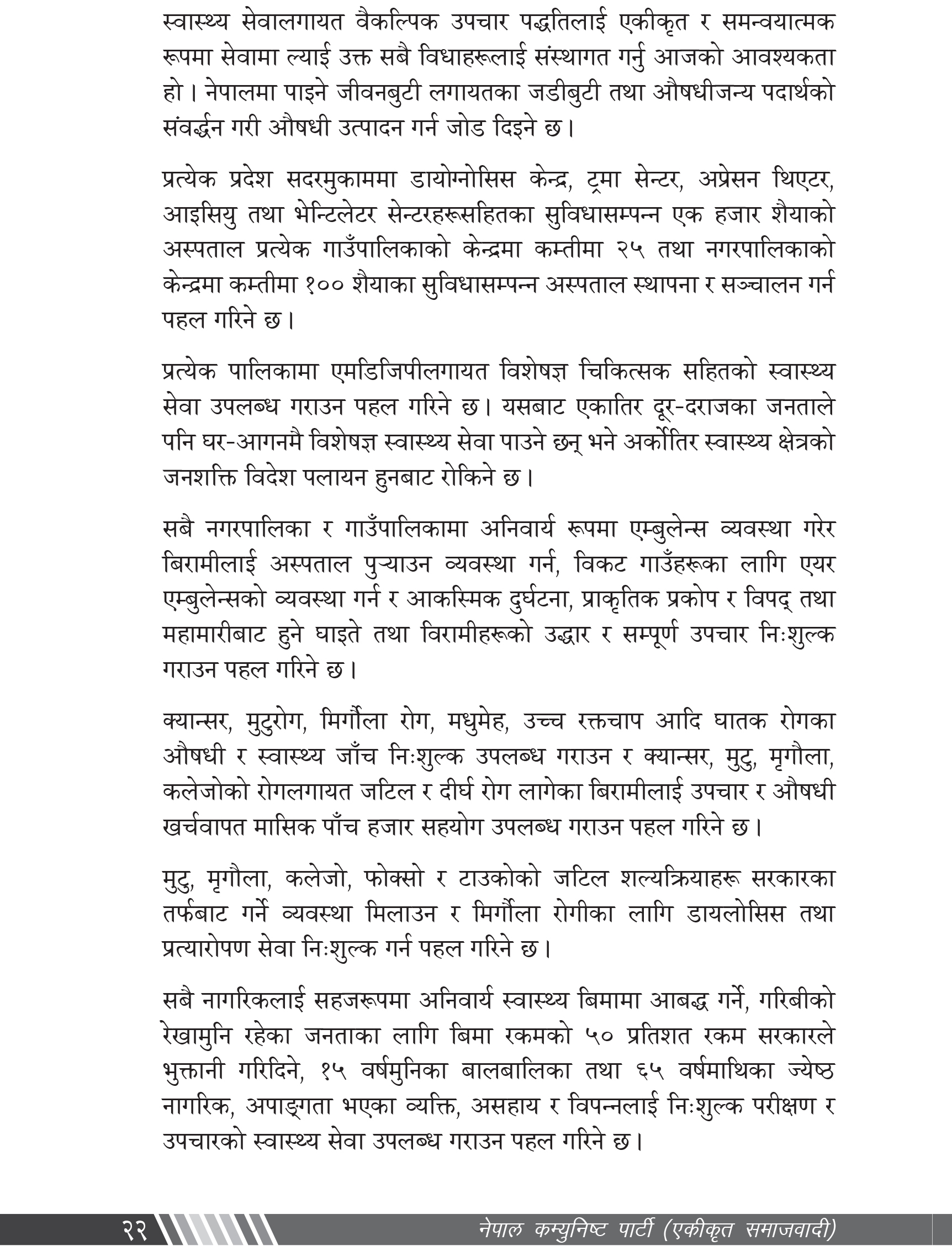 उसले स्वास्थ्य उपचार निःशुल्क उपलब्ध गराउन बजेटको पहिलो प्राथमिकतामा स्वास्थ्य सेवालाई राख्ने उल्लेख गरेको छ । यस्तै, नेपालमा पाइने जीवनबुटीलगायतका जडीबुटी तथा औषधीजन्य पदार्थको उत्पादनमा जोड दिने, प्रत्येक प्रदेश सदरमुकाममा डाइग्नोसिस केन्द्र, ट्रमा सेन्टर, अप्रेसन थिएटर, आईसीयु तथा भेन्टिलेटर सेन्टरहरूसहितका सुविधासम्पन्न एक हजार शैय्याको अस्पताल स्थापना गर्ने महत्वकांक्षी योजना पनि समाजवादीको घोषणा पत्रमा छ ।