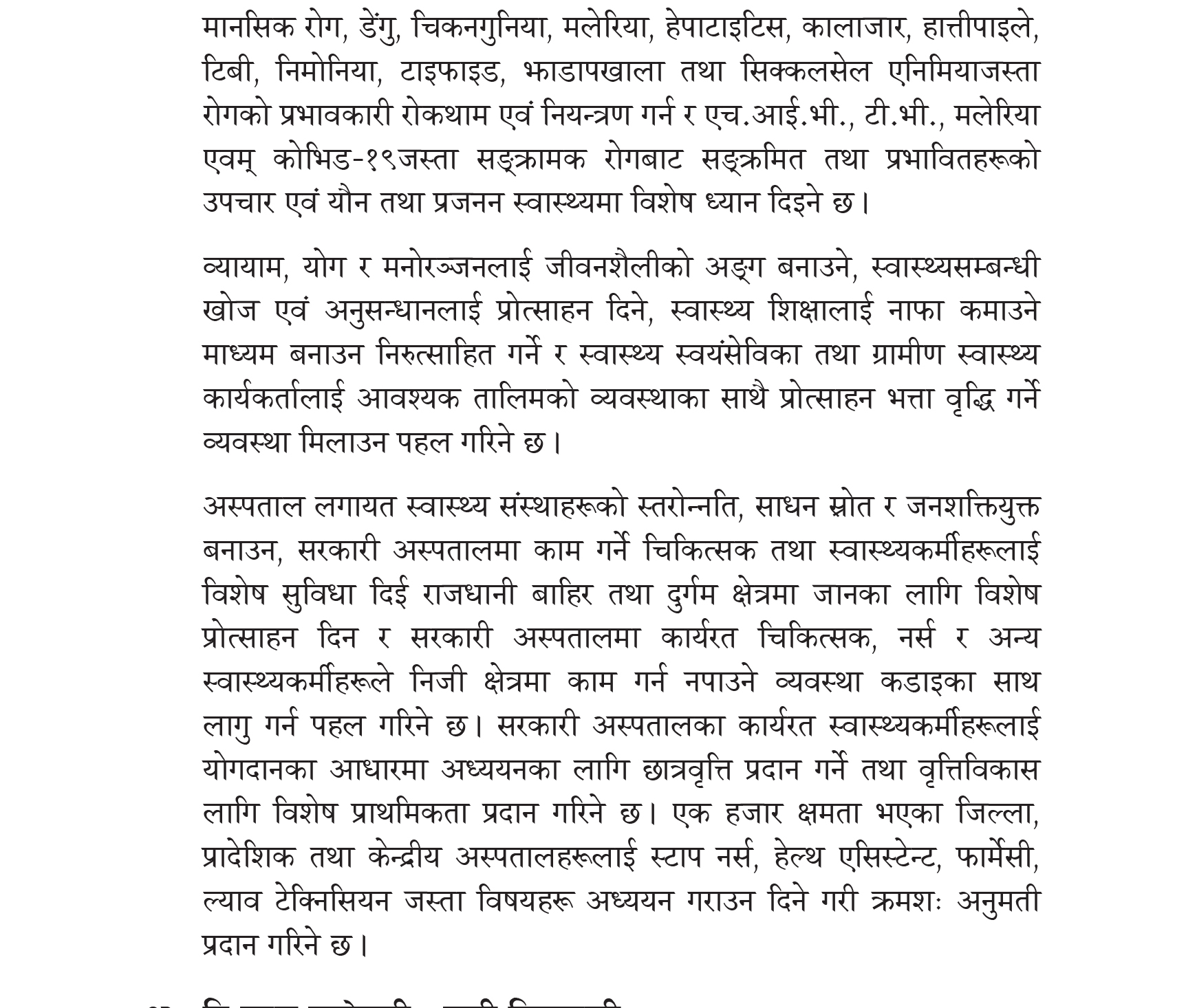 यस्तै, घोषणापत्रमा समाजवादीले क्यान्सर, मुटुरोग, मिर्गाैला रोग, मधुमेह, उच्च रक्तचापलगायतका घातक रोगका औषधी र स्वास्थ्य जाँच निःशुल्क उपलब्ध गराउन र क्यान्सर, मुटु, मृगौला, कलेजोको रोगलगायत जटिल र दीर्घ रोग लागेका बिरामीलाई उपचार र औषधी खर्चवापत मासिक पाँच हजार सहयोग उपलब्ध गराउन पहल गरिने समाजवादीले जनाएको छ । मुटु, मृगौला, कलेजो, फोक्सो र टाउकोको जटिल शल्यक्रियाहरू सरकारका तर्फबाट गर्ने व्यवस्था मिलाउन र मिर्गौला रोगीका लागि डायलोसिस तथा प्रत्यारोपण सेवा निःशुल्क गर्न पहल गरिने छ ।