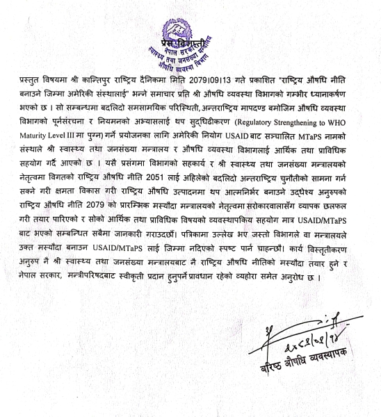 बिहीबार विभागले एक विज्ञप्ति जारी गर्दै नयाँ नीतिको प्रारम्भिक मस्यौदा सरोकारवालाहरुसँग व्यापक छलफल गरी स्वास्थ्य तथा जनसंख्या मन्त्रालयको नेतृत्वमा तयार गरेको र त्यसको व्यवस्थापकीय सहयोग मात्रै युएसएआईडी÷एमटिएपीएसले गरेको जनाएको छ । विभागले स्वास्थ्य तथा जनसंख्या मन्त्रालयबाट नै राष्ट्रिय औषधी नीतिको मस्यौदा तयार हुने र नेपाल सरकार मन्त्रिपरिषद्बाट स्वीकृत हुने प्रावधान रहेको पनि स्मरण गराएको छ ।