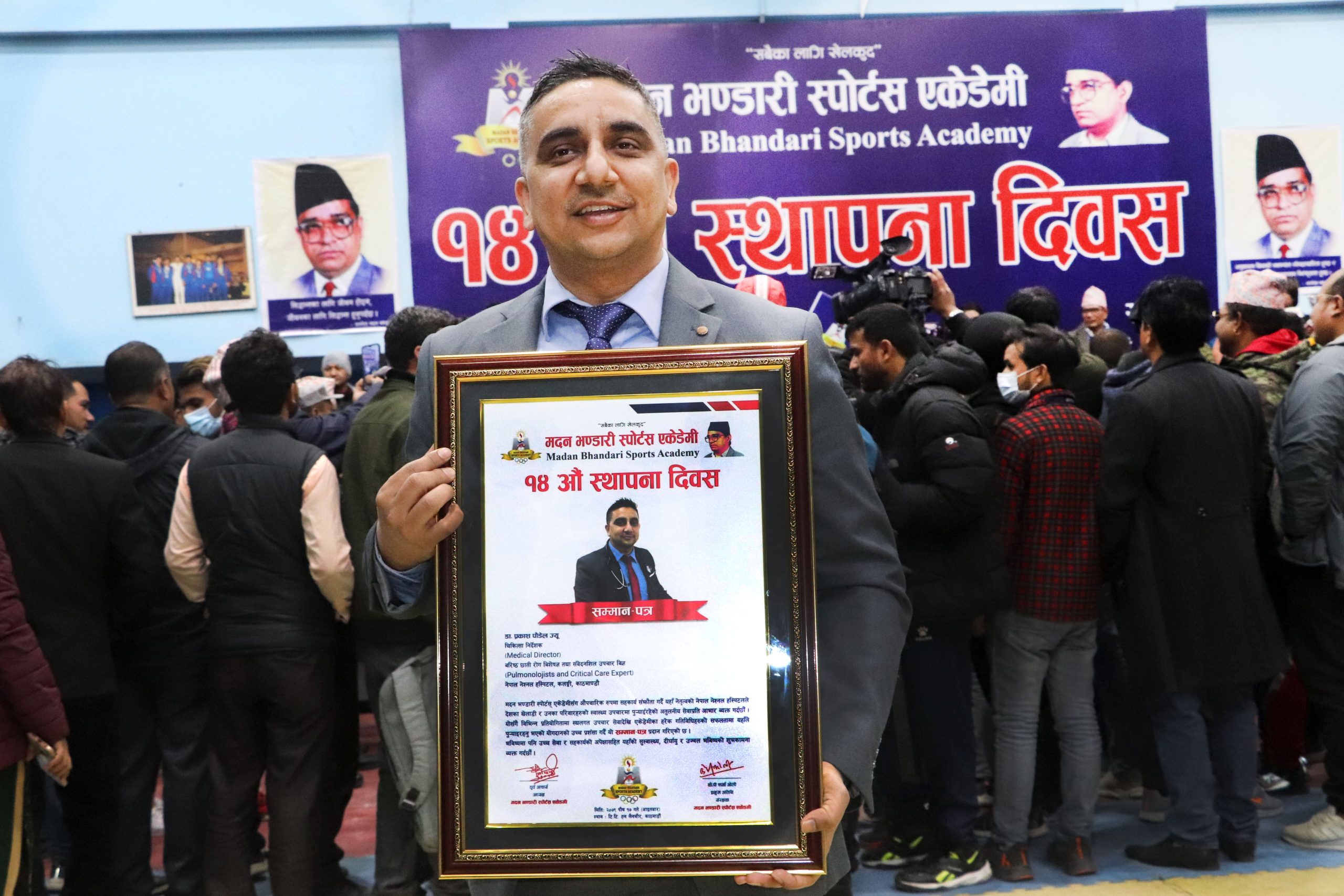 एकेडेमीको १४ औं स्थापना दिवसको अवसरमा आयोजित कार्यक्रममा प्रमुख अतिथी नेकपा एमालेका अध्यक्ष एवं पूर्व प्रधानमन्त्री केपी शर्मा ओलीले डा. पौडेललाई सम्मान पत्र प्रदान गरेका थिए । नेपाल नेशनल हस्पिटलले मदन भण्डारी स्पोर्टस एकेडेमीसँग सहकार्य गर्दै आएको छ । ओली मदन भण्डारी स्पोर्टस एकेडेमीका संरक्षक समेत हुन् ।