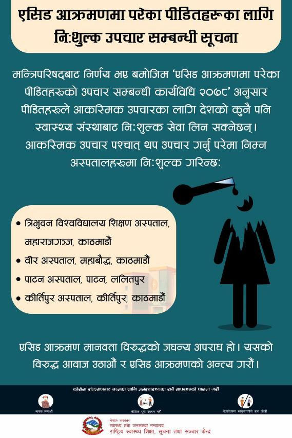 गृहपृष्ठ ∕ समाचार ∕ काठमाडौं उपत्यकाका ४ अस्पतालमा एसिड पीडितको निःशुल्क उपचार हुने काठमाडौं उपत्यकाका ४ अस्पतालमा एसिड पीडितको निःशुल्क उपचार हुने हेल्थ आवाज मंगलबार, २०७९ पुस २६ गते, १२:२८ मा प्रकाशित तस्विरः नवराज वाग्ले/हेल्थआवाज काठमाडौं—काठमाडौं उपत्यकाका चार वटा सरकारी अस्पतालमा एसिड पीडित बिरामीहरुको निःशुल्क उपचार हुने भएको छ । स्वास्थ्य तथा जनसंख्या मन्त्रालयकाअनुसार त्रिवि शिक्षण अस्पताल महाराजगन्ज, वीर अस्पताल, पाटन अस्पताल र कीर्तिपुर अस्पतालमा एसिड आक्रमणमा परेकाको निःशुल्क उपचार हुनेछ । मन्त्रालयले ‘एसिड आक्रमणमा परेका पीडितहरुको उपचार सम्बन्धी कार्यविधी, २०७८’ अनुसार पीडितहरुले आकस्मिक उपचार भने देशका जुनसुकै स्वास्थ्य संस्थाबाट पनि निःशुल्क लिने पाउनेछन् । क्याटेगोरी : समाचार तपाईको प्रतिक्रिया दिनुहोस सम्बन्धित समाचार स्वास्थ्यमन्त्रीद्वारा पदभारपछि पहिलो निर्णय गर्ने परम्परामा ‘ब्रेक’ स्वास्थ्य तथा जनसंख्या मन्त्रालयमा गाभियो खानेपानी मन्त्रालय स्वास्थ्य तथा जनसंख्यामन्त्री निशा मेहताले लिइन् सपथ ३८ वर्षीया निशा मेहता स्वास्थ्य तथा जनसंख्यामन्त्री नियुक्त नवनियुक्त प्रधानमन्त्री बालेन्द्र शाहले लिए सपथ ३८ वर्षीया निशा मेहता स्वास्थ्य तथा जनसंख्यामन्त्री बन्दै धेरै पढिएका १ बालबालिकामा देखिने दन्त सडनः अर्ली चाइल्डहुड केरिज २ मनमोहन प्राविधिक विश्वविद्यालयको प्रस्तावः धनकुटा अस्पताललाई ३०० शय्याको शिक्षण अस्पताल बनाउने ३ स्वास्थ्य सेवाः खर्च होइन, लगानी हो भनेर कहिले बुझ्ने? ४ किष्ट टिचिङ हस्पिटलमा मुख स्वास्थ्य सम्बन्धि जनचेतनामूलक कार्यक्रम सम्पन्न ५ ७ अर्ब १५ करोडमा ठेक्का सम्झौता भएको १२०० शय्याको लुम्बिनी अस्पतालको भौतिक प्रगति ३८.५ प्रतिशत ६ ४ अर्ब लगानीमा बनेको ३०० शय्याको सन्जीवनी टिचिङ हस्पिटल माघ मसान्तबाट सञ्चालनमा आउने ७ योग के हो ? यसका प्रकार र फाइदा TFN ट्रेण्डिङ गर्भपतन गर्दा के कुरामा ध्यान दिने ? गर्भपतनपछि आउन सक्छन् यस्ता जटिलता महिलाहरुको तल्लो पेट किन दुख्छ ? कारण, लक्षण र उपचार किन महत्वपूर्ण छ मुख स्वास्थ्य ? कसरी राख्ने दाँत र मुख स्वस्थ ? कसरी गर्ने दाँत र मुख स्वास्थ्यको हेरचाह ? नेपाल हियरिङ एण्ड स्पीच क्लिनिकमार्फत ४० वर्षीय पुरुषोत्तम भुर्तेलको व्यवसायिक उडान ३८ वर्षीया निशा मेहता स्वास्थ्य तथा जनसंख्यामन्त्री नियुक्त सरकारी जागिरे डा. रोशन पिजीका इन्ट्रान्स टपर स्वास्थ्य तथा जनसंख्यामन्त्री निशा मेहताले लिइन् सपथ गर्भपतन गर्दा के कुरामा ध्यान दिने ? गर्भपतनपछि आउन सक्छन् यस्ता जटिलता महिलाहरुको तल्लो पेट किन दुख्छ ? कारण, लक्षण र उपचार किन महत्वपूर