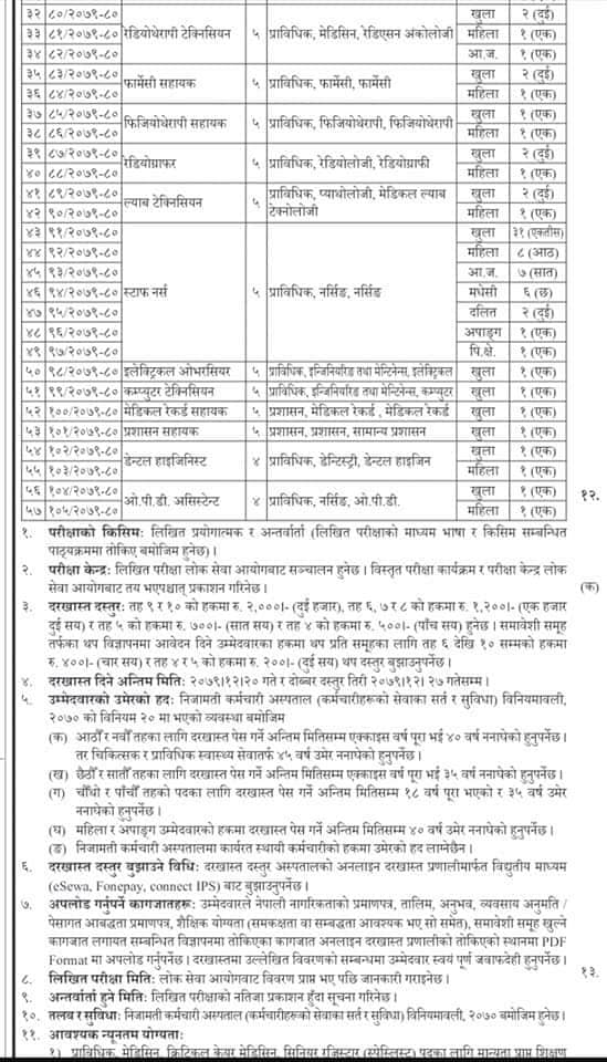 यस्तै, अस्पतालले ७ औं तहको वरिष्ठ रेडियोग्राफी टेक्नोलोजिष्ट १ जना, ७ औं तहकै ल्याब टेक्नोलोजिष्ट, प्थालोजिष्ट १ जनासहित अन्य विभिन्न पदहरुमा कर्मचारी माग गरेको हो ।