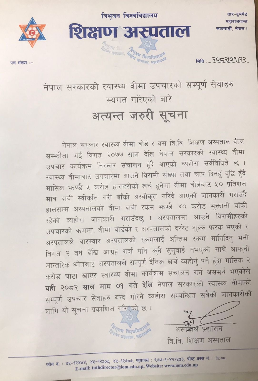 काठमाडौं—त्रिवि शिक्षण अस्पतालले १ माघदेखि स्वास्थ्य बीमाका सम्पूर्ण सेवाहरु स्थगित गर्ने जनाएको छ । बिहीबार अस्पताल प्रशासनले एक सूचना प्रंकाशित गर्दै १ माघदेखि स्वास्थ्य बीमाको सम्पूर्ण उपचार सेवाहरु बन्द गर्ने जानकारी दिएको हो ।