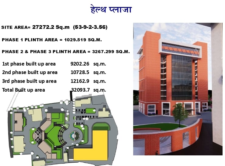 परियोजना तीन चरणमा सम्पन्न गर्ने गरी विस्तृत अध्ययन प्रतिवेदन तयार गरिएको छ। पहिलो चरणमा ९,२०२ वर्ग मिटर, दोस्रो चरणमा १०,७२८ वर्ग मिटर र तेस्रो चरणमा १२,१६२ वर्ग मिटर क्षेत्रफलमा भवन निर्माण गर्ने योजना छ। यसरी कुल ३२,०९३ वर्ग मिटर क्षेत्रफलको अत्याधुनिक हेल्थ प्लाजा निर्माण गर्ने तयारी गरिएको छ।