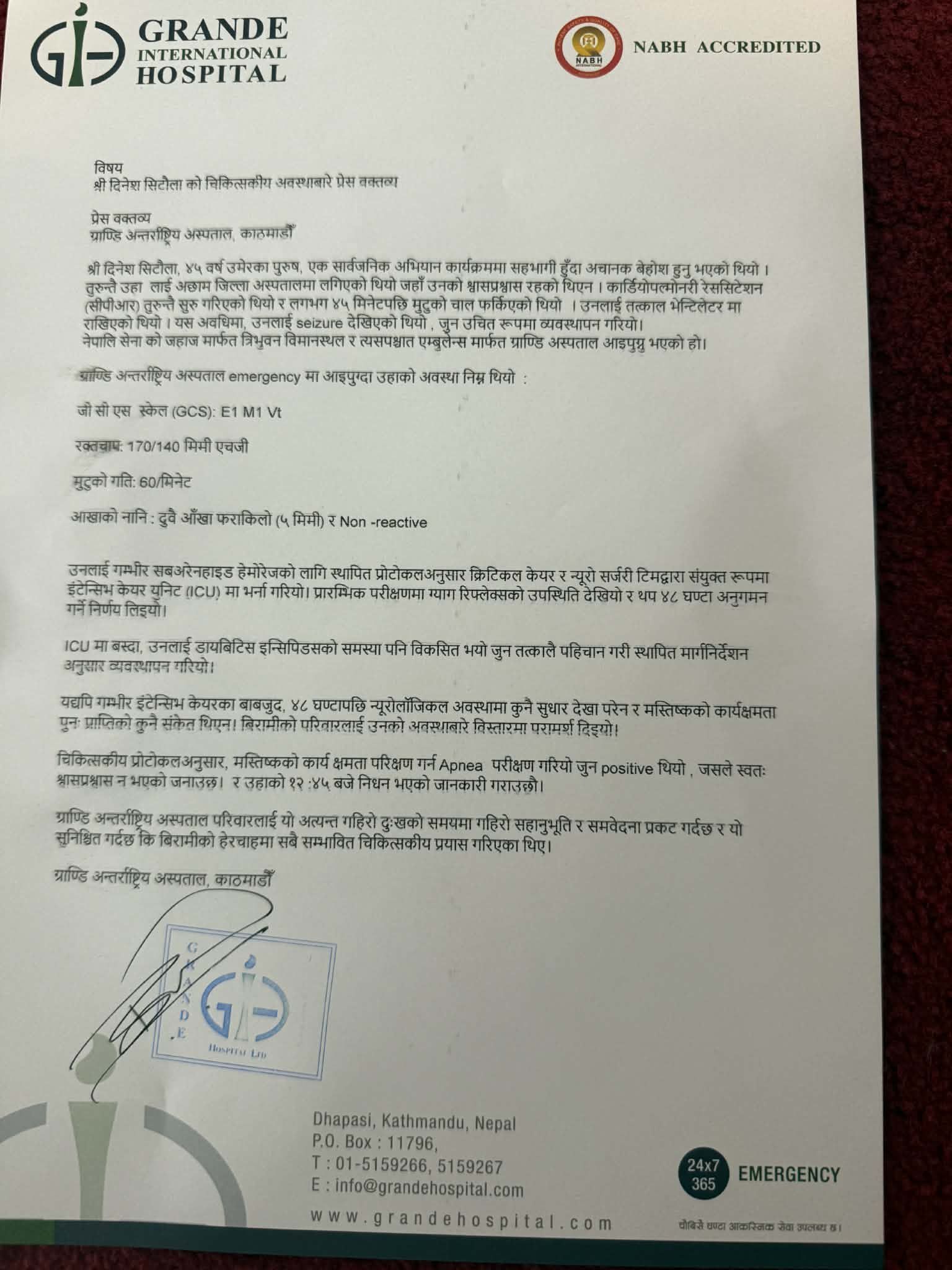 गृहपृष्ठ ∕ समाचार ∕ पत्रकार दिनेश सिटौलाको सबअरेनहाइड हेमोरेजका कारण मृत्युः ग्राण्डी अस्पताल पत्रकार दिनेश सिटौलाको सबअरेनहाइड हेमोरेजका कारण मृत्युः ग्राण्डी अस्पताल हेल्थ आवाज आईतबार, २०८२ माघ १८ गते, १४:५१ मा प्रकाशित काठमाडाैं- रास्वपाका वरिष्ठ नेता बालेन्द्र साहको चुनावी प्रचारमा गएका वेला बेहोस भएका पत्रकार दिनेश सिटौलाको निधन भएको छ । काठमाडौ स्थित ग्राण्डी अन्तराष्ट्रिय अस्पतालले आइतवार १२ः४५ मा उनको मृत्यु भएको घोषणा गरेको हो । अस्पतालले सिटौलालाई सबअरेनहाइड हेमोरेज भएको र सो को उपचार पद्धती अनुसार क्रिटिकल केयर र न्यूरो सर्जरी टिमले उपचार गरेको उल्लेख गरेको छ । सिटौला अस्पताल ल्याइनु अघि नै अछाममा श्वासप्रश्वास बन्द भएर ४५ मिनेट सिपिआर(काडियो पल्मोनरी रेसिस्टेसन) दिएर मुटुको चाल पुन फर्काइएको त्यस अवधीमा ज्वरो आएको उल्लेख छ । त्यसको व्यवस्थापन गरी नेपाली सेनाको जहाजबाट काठमाडौ ल्याइएको उल्लेख छ । काठमाडौ ल्याएर आइसीयुमा उपचार गरीएको र त्यस समयमा पनि मधुमेह बढेको त्यसलाई नियन्त्रण गरीएको तर जटिल समस्या भएका कारण ४८ घण्टा उच्च निगरानी गर्दा पनि मस्तिस्क कार्यक्षमतामा पुन प्राप्तीको संकेत नदेखिएको अस्पतालले जारी गरेको विज्ञप्तीमा उल्लेख छ । क्याटेगोरी : समाचार तपाईको प्रतिक्रिया दिनुहोस सम्बन्धित समाचार एनपीआई नारायणी सामुदायिक अस्पतालको वार्षिक कारोबार ६४ करोड सानिमा र महतोको मेडिकेयर अस्पतालको एक वर्षको कारोबार ५७ करोड… सिटी स्क्यान मेसिन खरिदमा भ्रष्टाचारको आरोपमा राप्तीका तत्कालीन उपकुलपति विरुद्ध… अमेरिकास्थित द म्याक्स फाउण्डेसनको ग्लोबल थिंक ट्यांक सदस्यमा नेपाली अंकोलोजिस्ट… ८ अर्बमा बन्ने भनिएको टेकुको अत्याधुनिक हेल्थ प्लाजाको योजना के… कोशीका स्वास्थ्यमन्त्रीको ‘पावर’ : डेढ महिनामै उल्टाए कर्मचारीको सरुवा धेरै पढिएका १ नेपालमा भेटिए ९८ हजारभन्दा बढी क्यान्सरका बिरामी २ स्वास्थ्य मन्त्रालयको नीति, योजना तथा अनुगमन महाशाखा प्रमुखमा डा. चुमनलाल दास ३ ‘प्रदेशका चिकित्सकलाई उपेक्षा गरेर ‘गेस्ट’ चिकित्सकलाई नेतृत्व सुम्पिँदा संस्थागत सुदृढीकरण हुन सकेन’ ४ पाठेघरको मुखको क्यान्सरबाट बच्नलाई अपनाउन सकिने उपायहरू ५ स्वास्थ्य बीमालाई औषधी महंगोमा बेचिएको छ : स्वास्थ्यमन्त्री ६ क्षयरोग पहिचानमा ढिलाइ हुँदा दोलखामा तीन जनाको मृत्यु ७ स्वाकन इन्टरनेशनल हस्पिटलका संस्थापक निर्देशक रिमाल पक्राउ TFN ट्रेण्डिङ Young’s lip with tiny bugs: needs awareness of leishmaniasis एनपीआई नारायणी सामुदायिक अस्पतालको वार्षिक कारोबार ६४ करोड नेपालमा भेटिए ९८ हजारभन्दा बढी क्यान्सरका बिरामी अमेरिकास्थित द म्याक्स फाउण्डेसनको ग्लोबल थिं