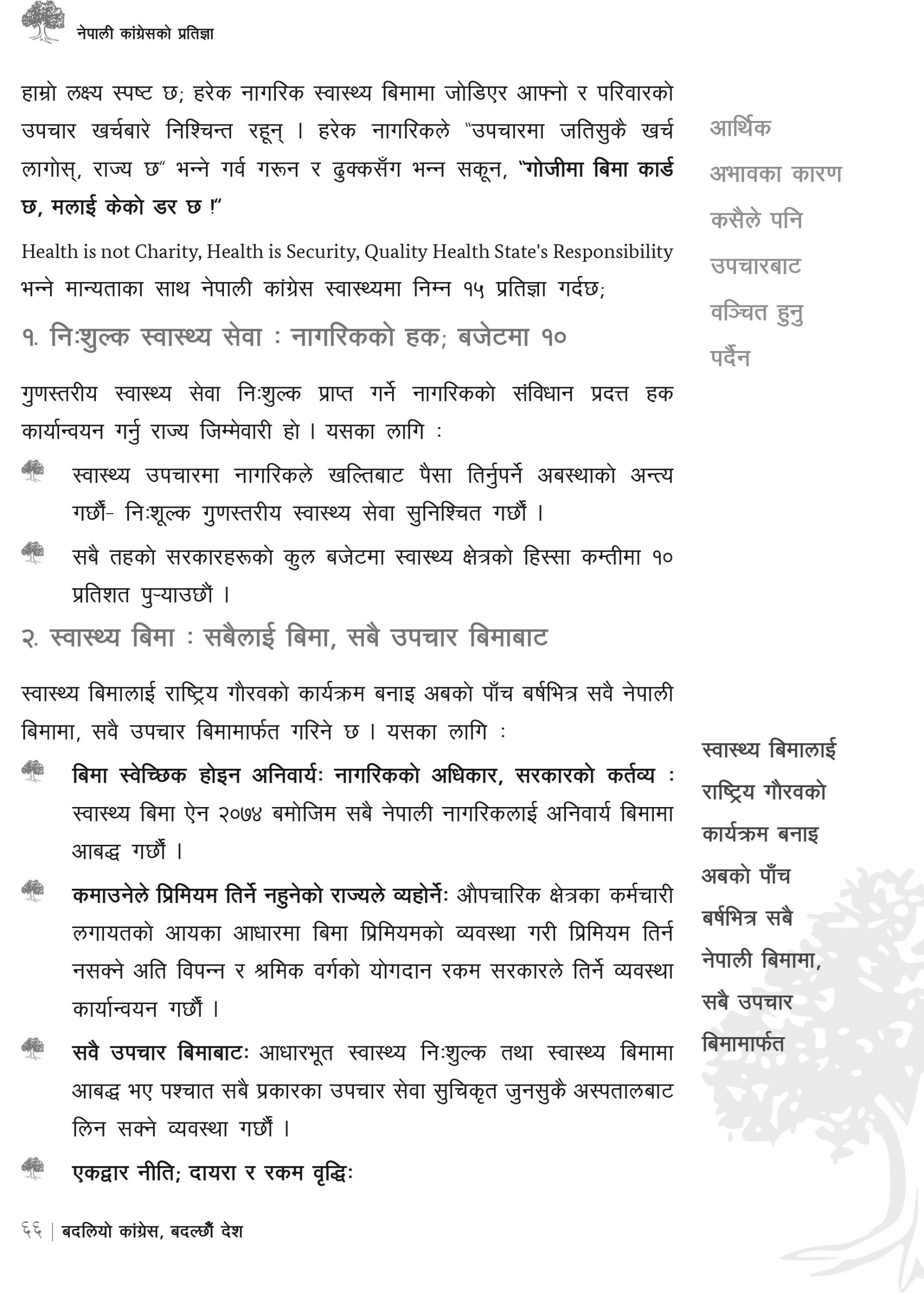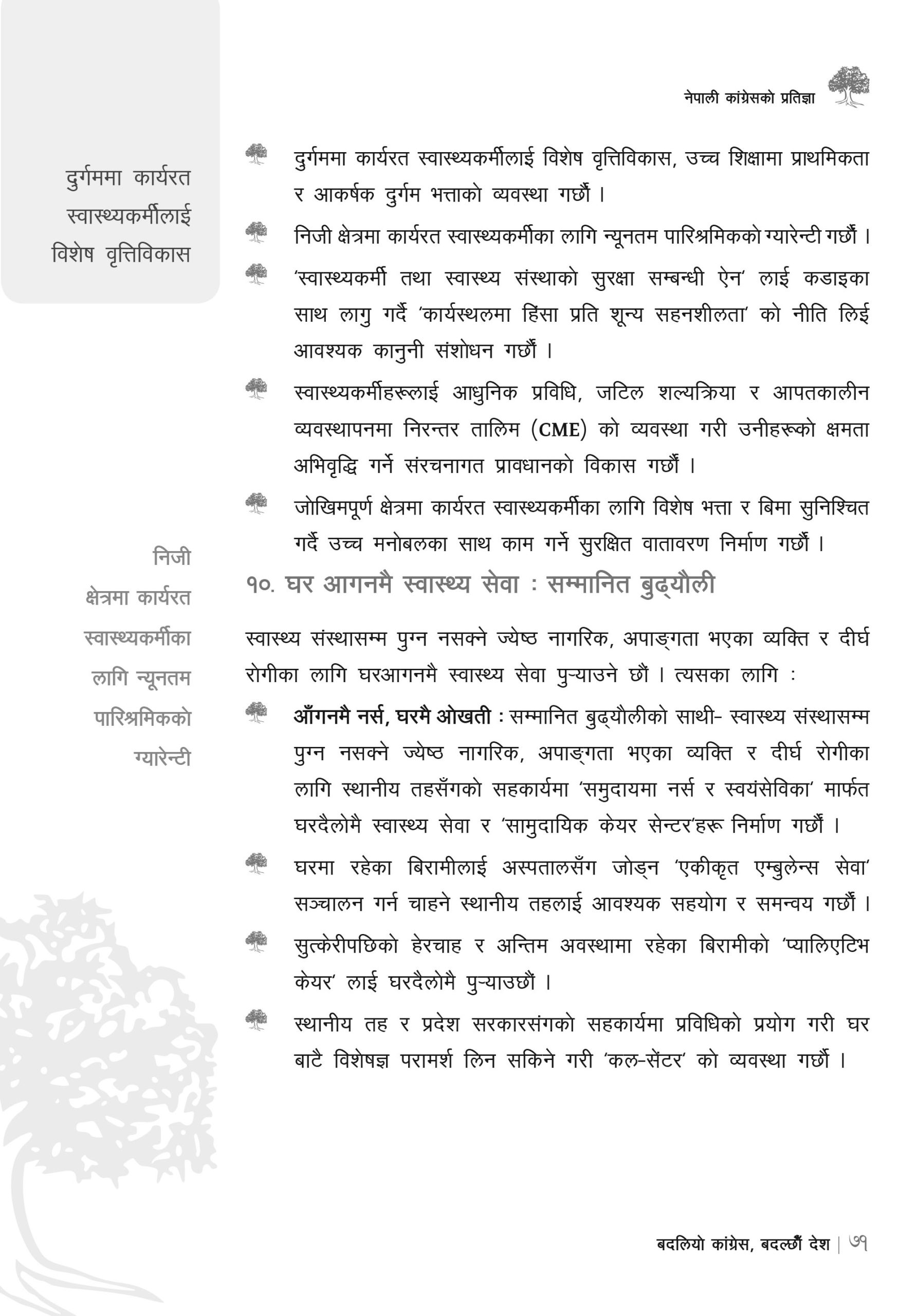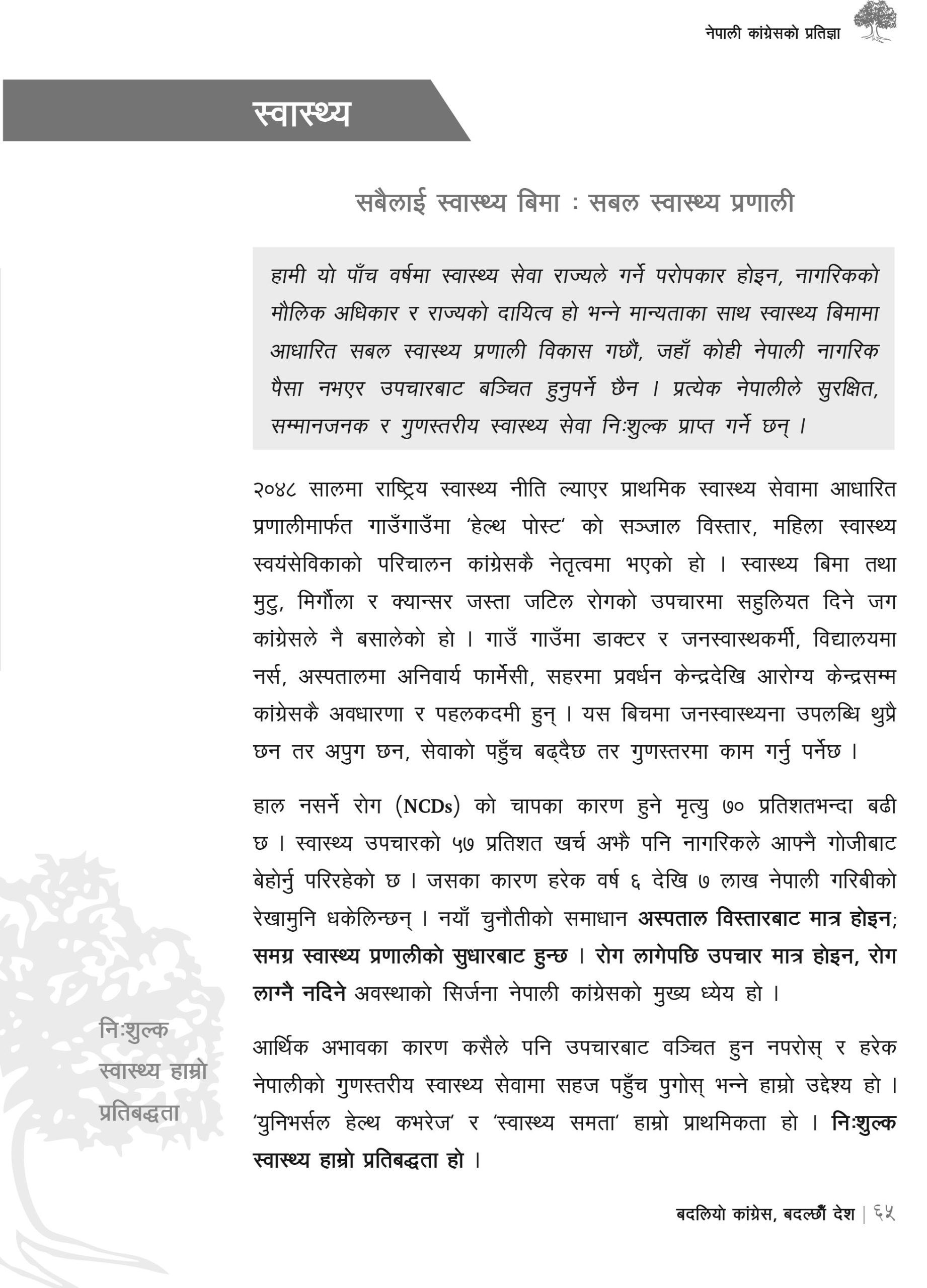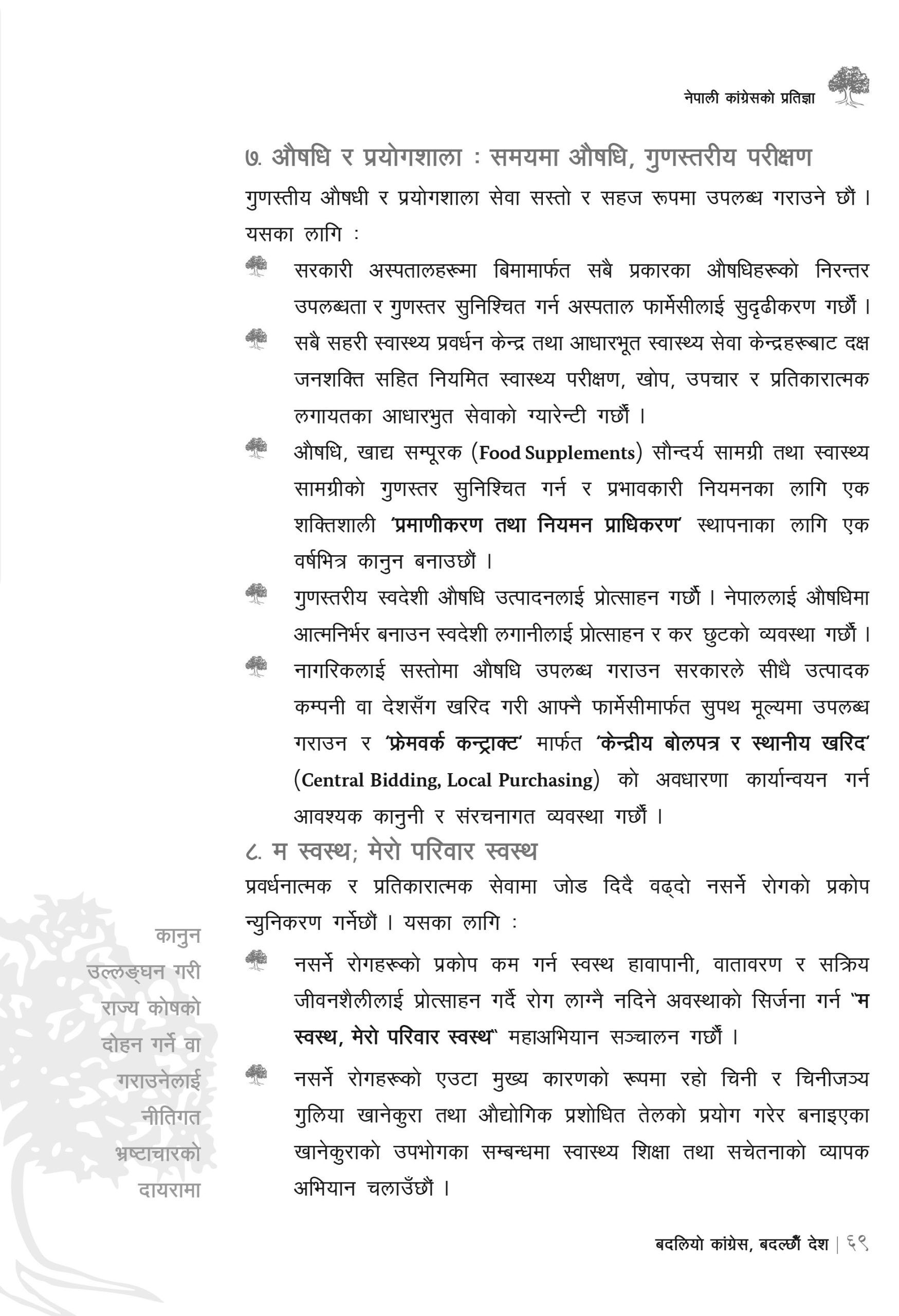 यस्तै, उसले ढुकुटीमा लुट बन्द गर्ने र स्वास्थ्यमा समान प्रबन्ध गर्ने, समयममा औषधी र गुणस्तरीय परीक्षण उपलब्ध गराउने, स्वास्थ्य जनशक्ति व्यवस्थापन गर्ने, म स्वस्थ मेरो परिवार स्वस्थ अभियान चलाउनेलगायतका प्रतिवद्धता पनि कांग्रेसको प्रतिज्ञामा छन् ।