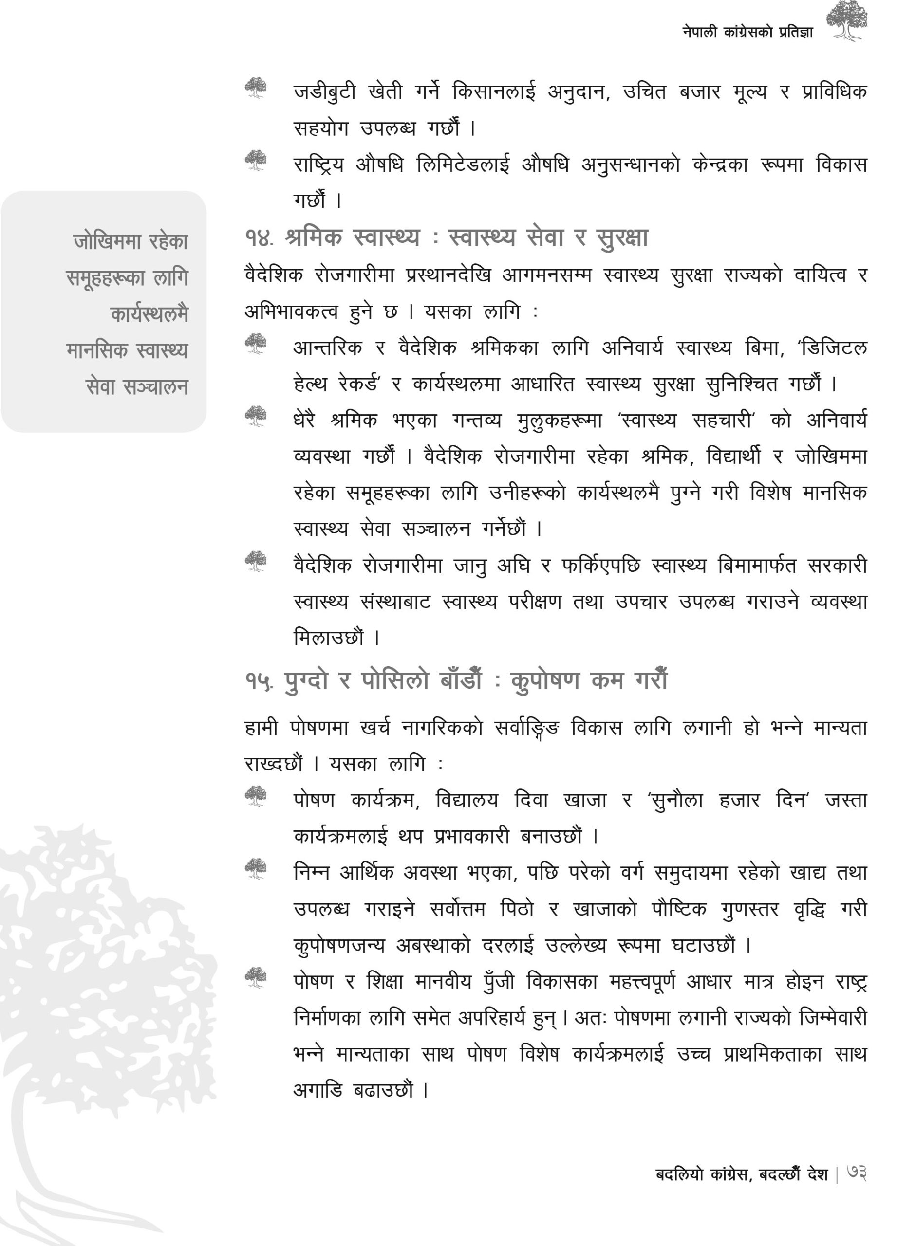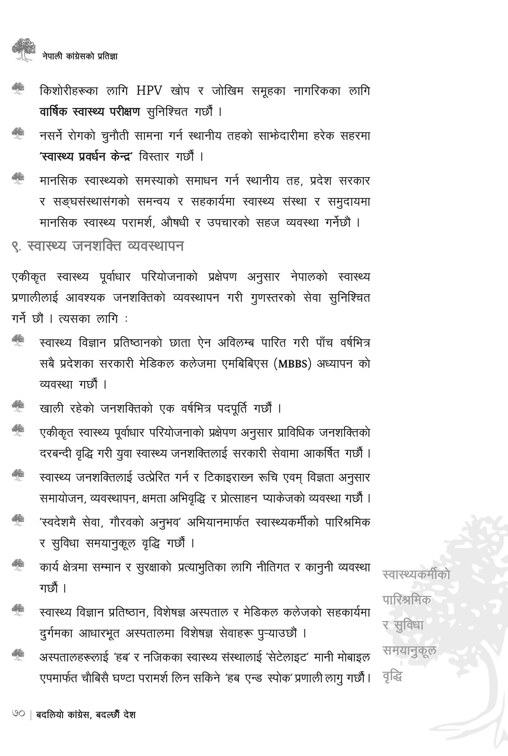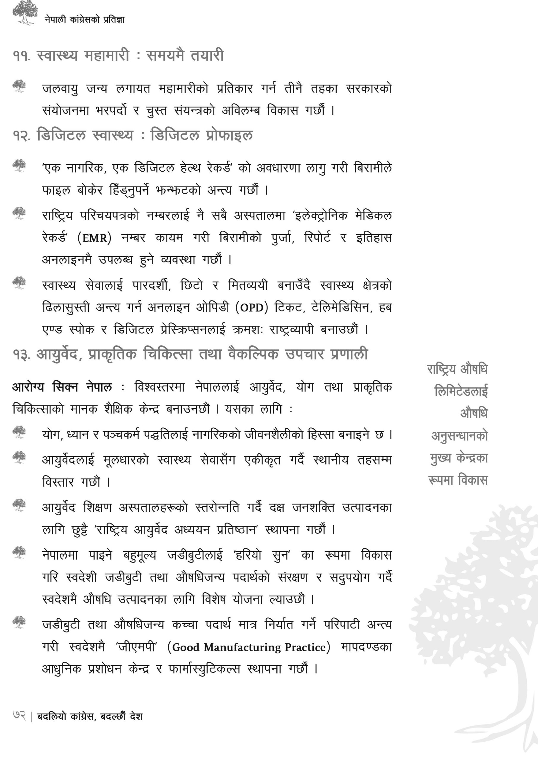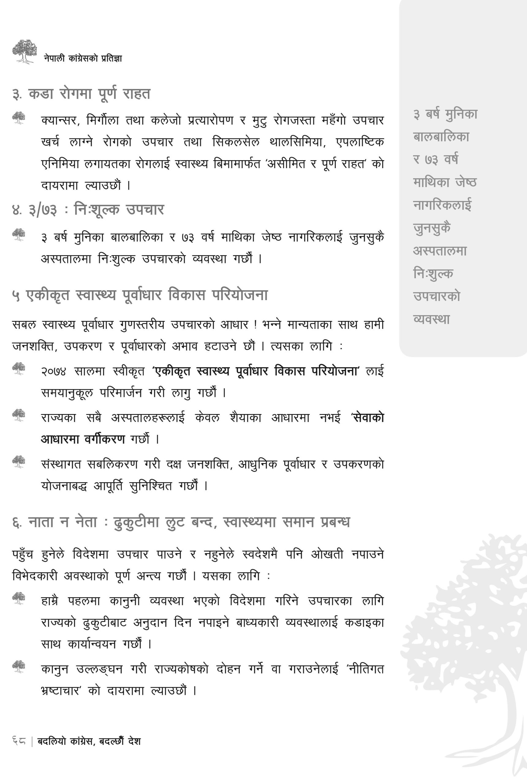 यस्तै, उसले ढुकुटीमा लुट बन्द गर्ने र स्वास्थ्यमा समान प्रबन्ध गर्ने, समयममा औषधी र गुणस्तरीय परीक्षण उपलब्ध गराउने, स्वास्थ्य जनशक्ति व्यवस्थापन गर्ने, म स्वस्थ मेरो परिवार स्वस्थ अभियान चलाउनेलगायतका प्रतिवद्धता पनि कांग्रेसको प्रतिज्ञामा छन् ।