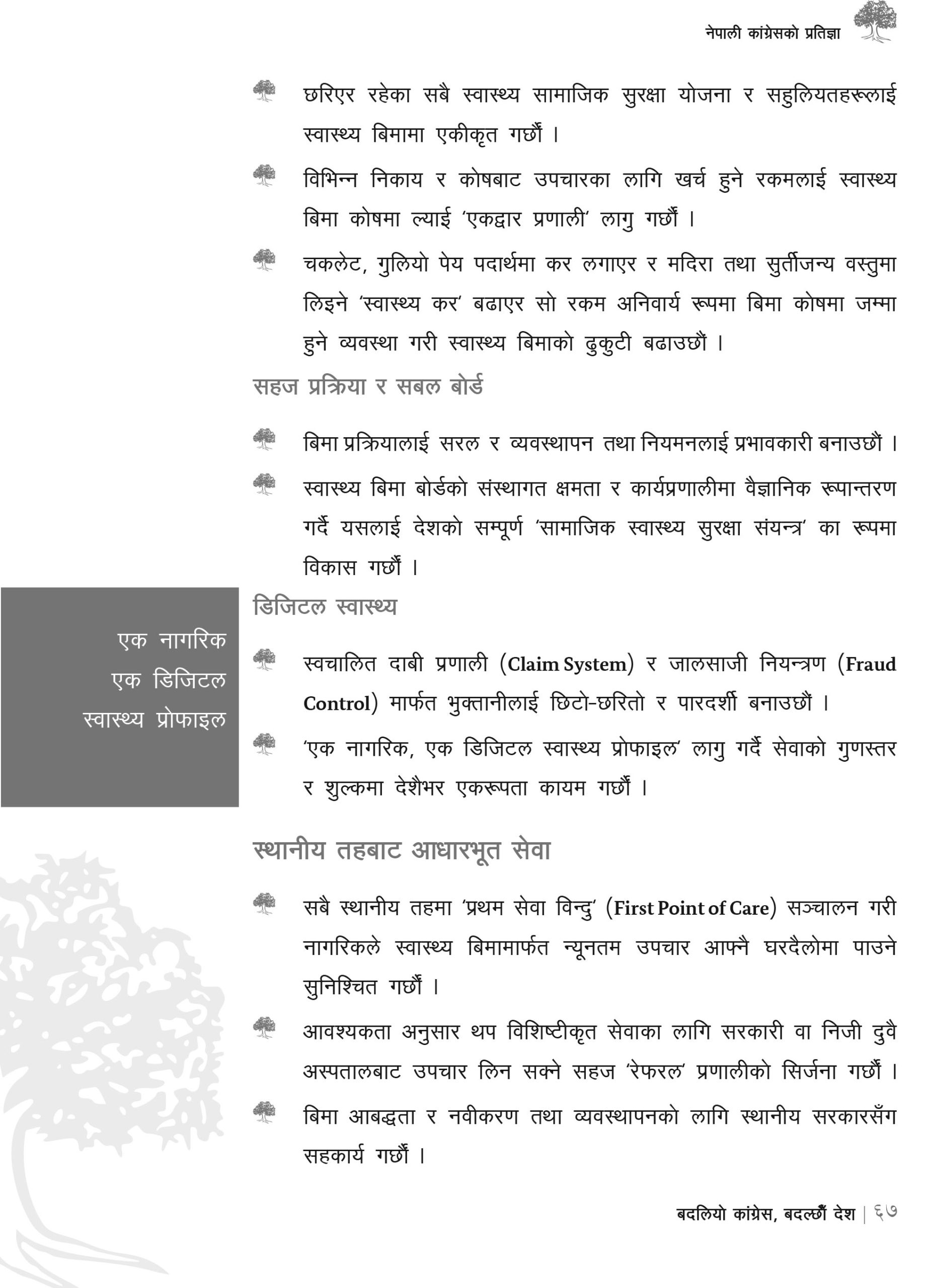 यस्तै, कमाउनेले प्रिमियम तिर्ने, नकमाउनेको राज्यले व्यहोर्ने, कडा रोगमा पूर्ण राहात दिने, ३ वर्षमुनि र ७३ वर्ष माथिका नागरिकको निःशुल्क उपचार गर्ने, एकीकृत स्वास्थ्य पूर्वाधार परियोजना तयार गर्ने कांग्रेसको प्रतिज्ञामा छ ।
