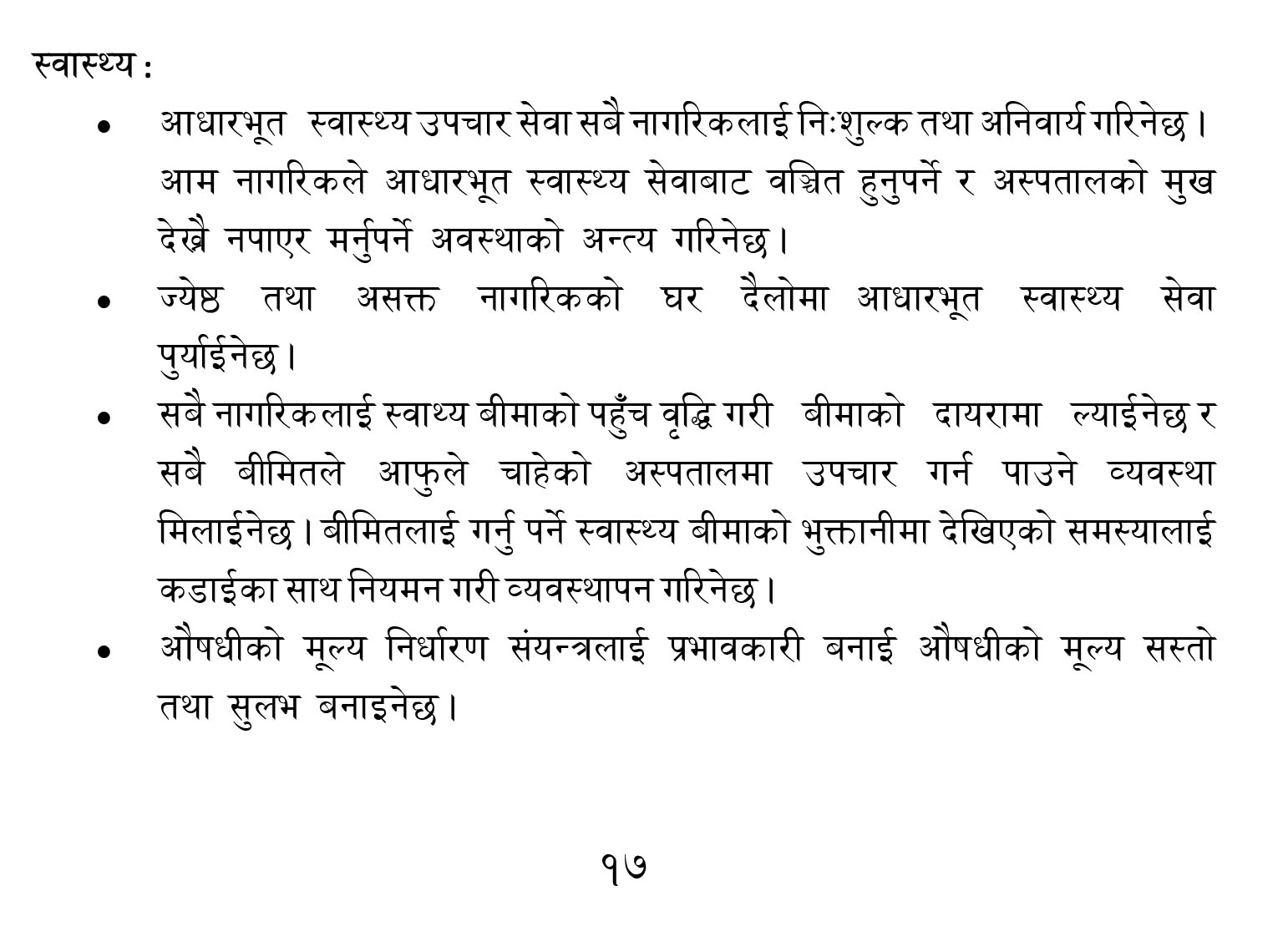 राप्रयाले आधारभूत स्वास्थ्य सेवा सबै नागरिकलाई निःशुल्क र अनिवार्य उपलब्ध गराउने, जेष्ठ नागरिक र अशक्तको घरमै आधारभूत स्वास्थ्य सेवा दिने, सबै नागरिकलाई बीमाको दायरामा ल्याउने, बीमा भुक्तानीमा देखिएको समस्या व्यवस्थापन गर्ने, औषधीको मुल्य निर्धारण संयन्त्र प्रभावकारी बनाए औषधी सस्तो र सुलभ बनाउने संकल्प गरेको छ ।