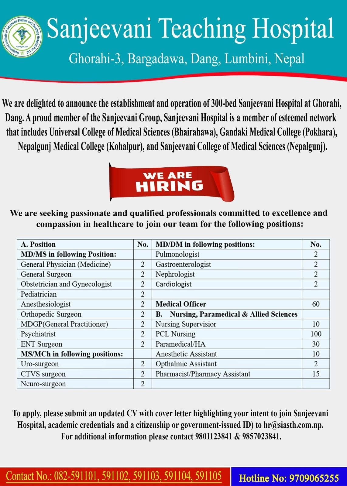 सन्जीवनी शिक्षण अस्पतालले १५ जना फार्मेसिष्ट माग गरेको छ । ४ अर्ब लगानीमा बनेको सन्जीवनी शिक्षण अस्पतालले यसअघि झण्डै ३ सय ५० जनाभन्दा बढी कर्मचारी भर्ना गरिसकेको छ ।