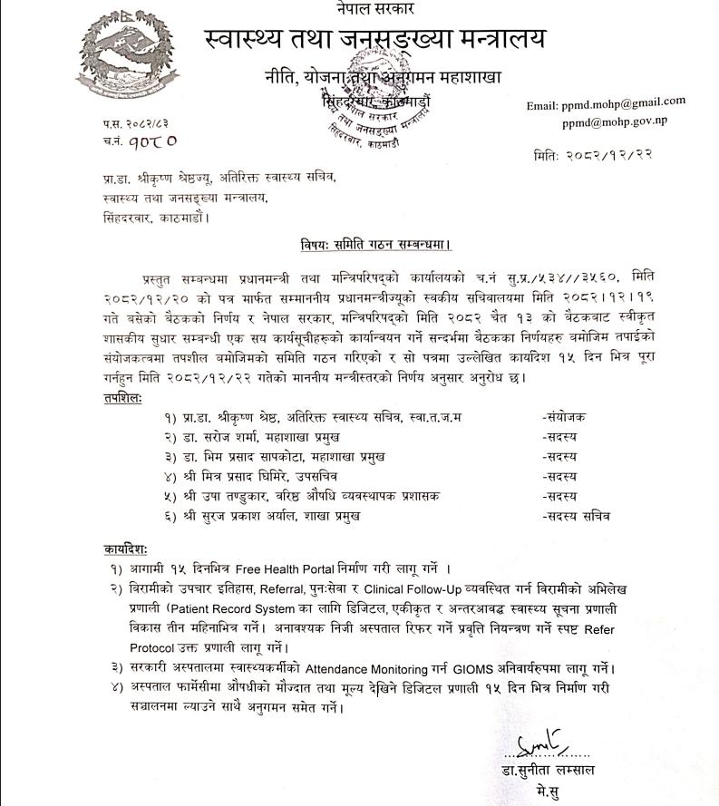 समितिलाई आगामी १५ दिनभित्र फ्री हेल्थ पोर्टल निर्माण गरी लागु गर्ने जिम्मेवारी दिइएको छ ।