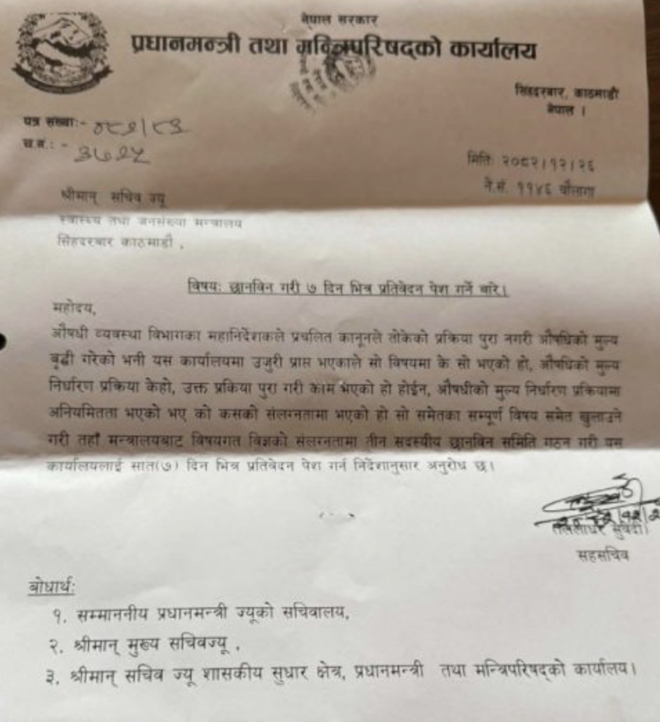 ‘औषधि व्यवस्था विभागका महानिर्देशकले प्रचलित कानुनले तोकेको प्रक्रिया पूरा नगरी औषधिको मूल्य वृद्धि गरेको भनी यस कार्यालयमा उजुरी प्राप्त भएकोले सो विषयमा के कसो भएको हो, औषधिको मूल्य निर्धारण प्रक्रिया के हो, उक्त प्रक्रिया पूरा गरी काम भएको हो वा होइन, औषधिको मूल्य निर्धारण प्रक्रियामा अनियमितता भएको भए को कसको संलग्नता रहेको हो सो सम्बन्धमा सम्पूर्ण विषय समेट्ने गरी तथा मन्त्रालयबाट विषयगत विज्ञको सहायतामा तीन सदस्यीय छानबिन समिति गठन गरी यस कार्यालयलाई सात(७) दिन भित्र प्रतिवेदन पेश गर्न निर्देशनानुसार अनुरोध छ,’ पत्रमा छ ।