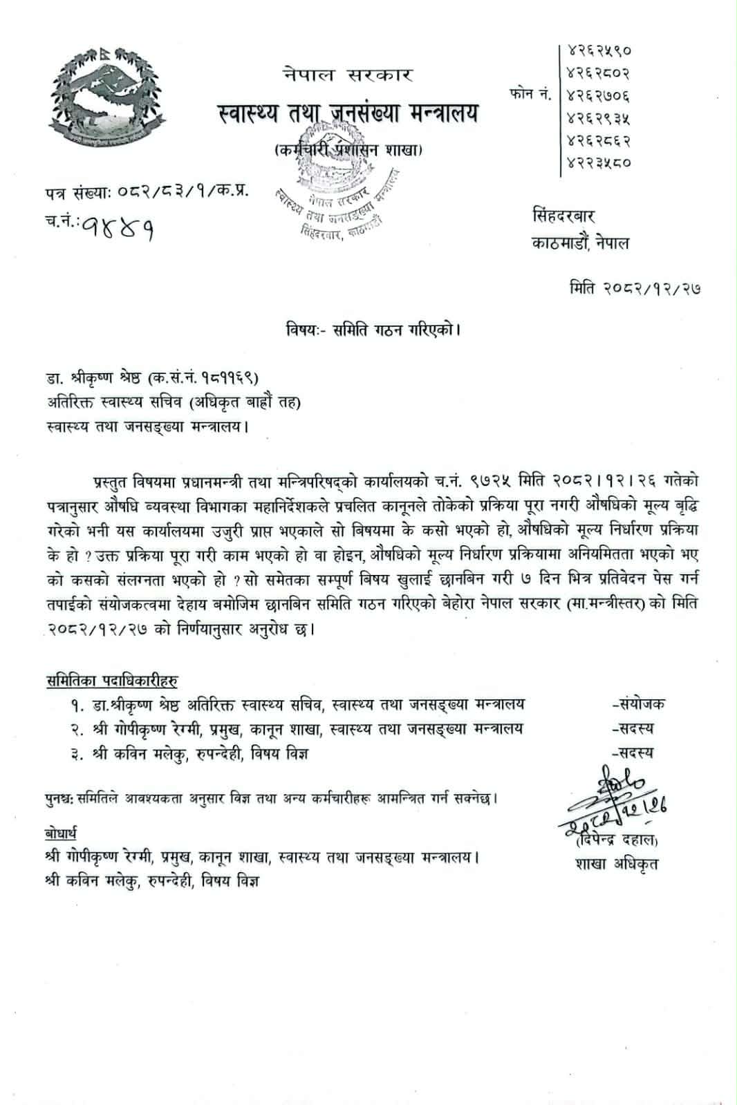 गृहपृष्ठ ∕ समाचार ∕ कानुन विपरित औषधिको मुल्यवृद्धिबारे छानविन गर्न अतिरिक्त सचिव डा. श्रेष्ठको नेतृत्वमा समिति गठन कानुन विपरित औषधिको मुल्यवृद्धिबारे छानविन गर्न अतिरिक्त सचिव डा. श्रेष्ठको नेतृत्वमा समिति गठन हेल्थ आवाज शुक्रबार, २०८२ चैत्र २७ गते, १९:५५ मा प्रकाशित काठमाडौं-स्वास्थ्य तथा जनसंख्या मन्त्रालयले कानुन विपरित औषधिको मुल्यवृद्धि गर्ने औषधि व्यवस्था विभागका महानिर्देशक नारायण ढकालमाथि छानविन गर्न समिति बनाएको छ । शुक्रबार प्रधानमन्त्री कार्यालयको निर्देशनपछि स्वास्थ्य तथा जनसंख्यामन्त्री निशा मेहताले मन्त्रीस्तरीय निर्णय गर्दै मन्त्रालयका अतिरिक्त सचिव डा. श्रीकृष्ण श्रेष्ठको नेतृत्वमा छानविन समिति गठन गरेको हो । | तीन सदस्सीय छानविन समितिमा मन्त्रालयको कानुन शाखाका प्रमुख गोपीकृष्ण रेग्मी र विषय विज्ञ कविन मलेकू सदस्य रहेका छन् । समितिलाई ७ दिनभित्र औषधिको मुल्य निर्धारण प्रक्रिया, प्रक्रिया पूरा गरी मुल्यवृद्धि भए नभएको, औषधिको मुल्यवृद्धिमा अनियमितता भएको भए को कसको संलग्नतामा भएको भन्ने विषयमा छानविन गरेर प्रतिवेदन पेश गर्न भनिएको छ । समितिले आवश्यक परेमा विज्ञ तथा अन्य कर्मचारी आमन्त्रित गर्न सक्ने अधिकार दिइएको छ । क्याटेगोरी : समाचार तपाईको प्रतिक्रिया दिनुहोस सम्बन्धित समाचार कानुन विपरीत औषधिको मूल्यवृद्धि प्रकरणमा ढकालमाथि छानविन गरेर ७ दिनभित्र… सरकारी अस्पतालले कामको चाप र जनशक्ति हेरेर आइतबार ओपीडी सेवा… कानुन विपरित औषधिको मुल्यवृद्धि गरेका औषधि व्यवस्था विभागका महानिर्देशक नारायण… स्वास्थ्यमन्त्री मेहतालाई सचेत गराउन सिफारिस, श्रममन्त्री साहलाई हटाइयो कानुन विपरित औषधिको मुल्यवृद्धि प्रकरण संसदमा, अख्तियारको अनुसन्धानमाथि उठ्यो प्रश्न स्वास्थ्य तथा जनसंख्या मन्त्रालयलाई सच्चिन श्रममन्त्री साहको आग्रह धेरै पढिएका १ नेपाल हियरिङ एण्ड स्पीच क्लिनिकमार्फत ४० वर्षीय पुरुषोत्तम भुर्तेलको व्यवसायिक उडान २ एएमएसपी सम्बन्धि दुई दिने कार्यशाला गोष्ठी सम्पन्न ३ सरकारी जागिरे डा. रोशन पिजीका इन्ट्रान्स टपर ४ हेलो सरकारबाट प्राप्त गुनासो सम्बोधनका लागि फोकल पर्सन तोक्न ४६ निकायलाई स्वास्थ्य मन्त्रालयको परिपत्र ५ सुदूरपश्चिममा १०० शय्याका ६ निजी अस्पताल, २ निजी अस्पताल स्वीकृतीका लागि प्रक्रियामा ६ कार्यालय समयमा अनुपस्थित रहने कर्मचारीलाई तह लगाउन वीर अस्पताल व्यवस्थापनका एक दर्जन बढी निर्णय ७ निःशुल्क वितरण गरिने औषधि स्वदेशमै उत्पादन गर्नेबारे छलफल TFN ट्रेण्डिङ नेपाल हियरिङ एण्ड स्पीच क्लिनिकमार्फत ४० वर्षीय पुरुषोत्तम भुर्तेलको व्यवसायिक उडान आर्या न्यूरोमा जटिल 