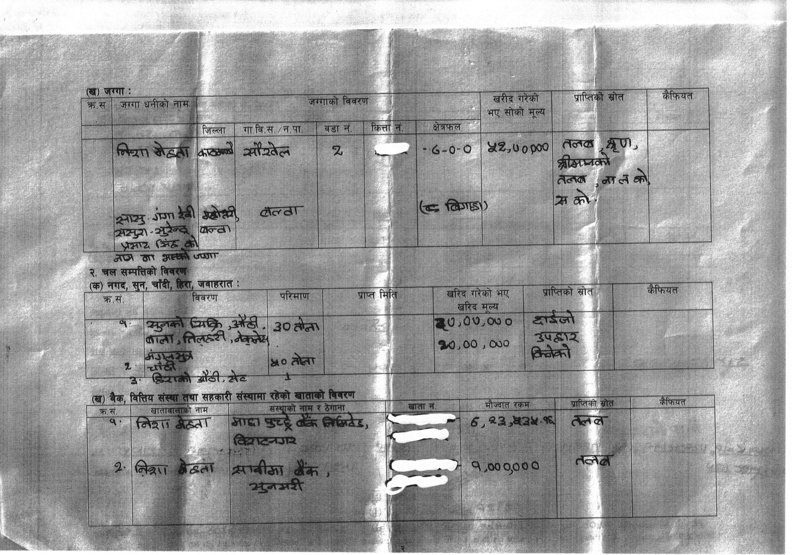 सुन, चाँदी र हिराको गहनाको स्रोत दाइजो, उपहार र किनेको भनेर उनले सम्पत्ति विरणमा उल्लेख गरेकी छन् ।