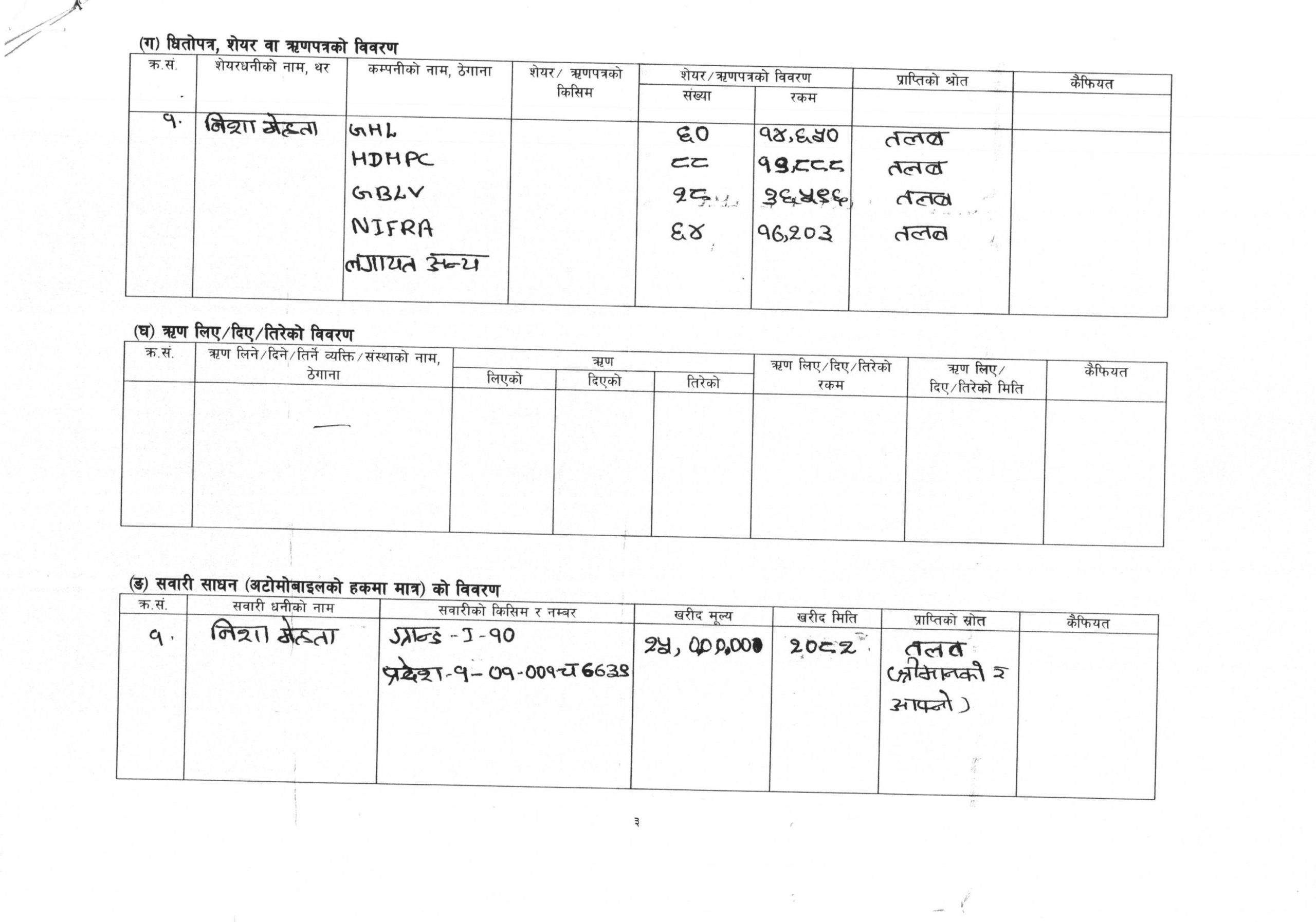 यसैगरी, मन्त्री मेहतासँग माछापुच्छ्रे बैंकमा ७ लाख २३ हजार ५३५ रुपैयाँ र सानिमा बैंकमा १० लाख रुपैयाँ नगद मौज्दात रहेको सम्पत्ति विवरणमा उल्लेख गरेकी छन् । जुन मौज्दातको स्रोत तलब रहेको उनले बताएकी छन् ।
