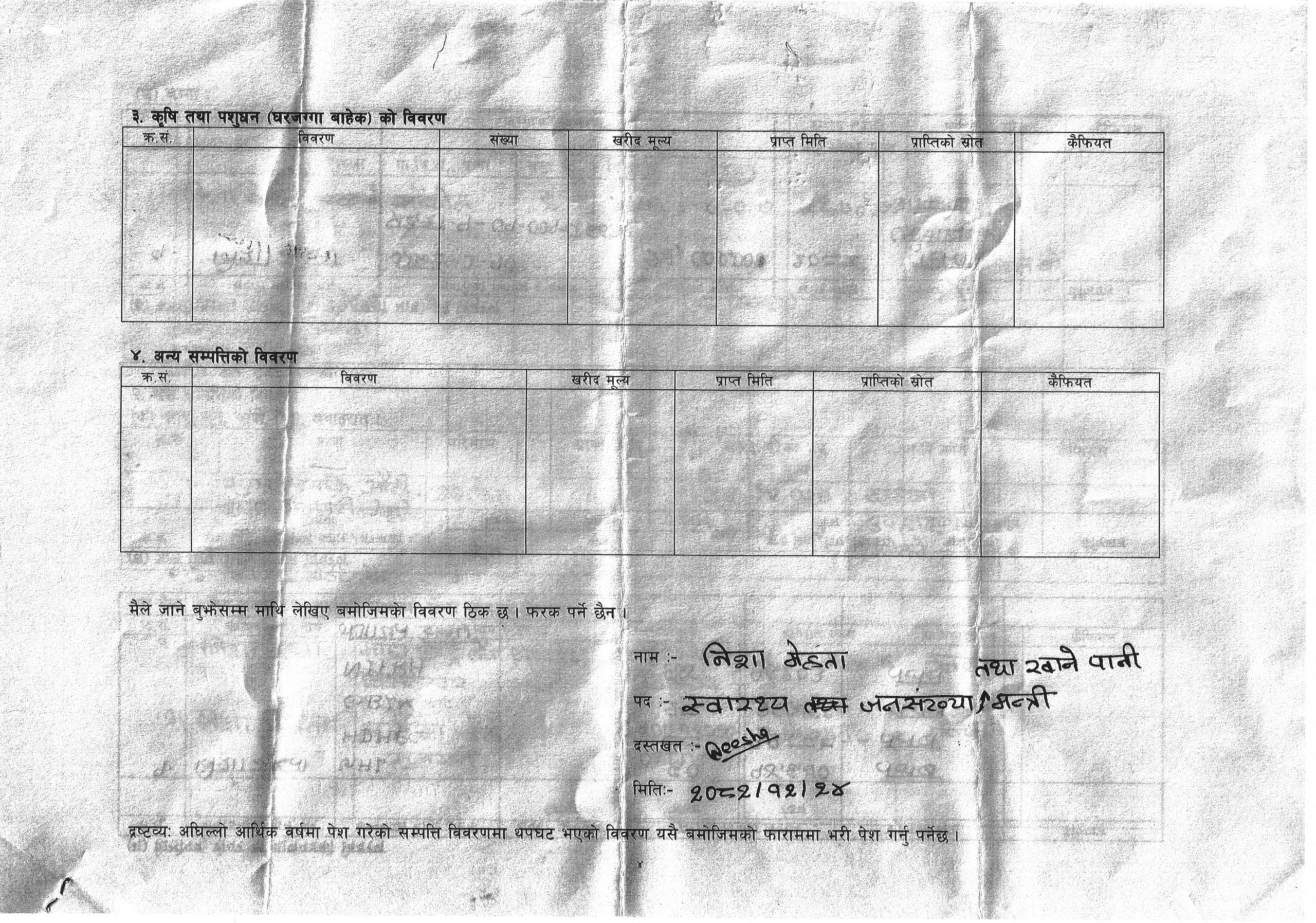 काठमाडौं—स्वास्थ्य तथा जनसंख्या, खानेपानी मन्त्री निशा मेहताले सम्पत्ति ३० तोला सुन १७ लाख रुपैयाँभन्दा बढी बैंकमा नगद रहेको पाइएको छ । आइतबार प्रधानमन्त्री तथा मन्त्रिपरिषद् कार्यालयले सार्वजनिक गरेको मन्त्रीहरुको सम्पत्ति विवरणमा मेहतासँग ३० तोला सुन ५० तोला चाँदी र एउटा हिराको औठी रहेको देखिन्छ ।