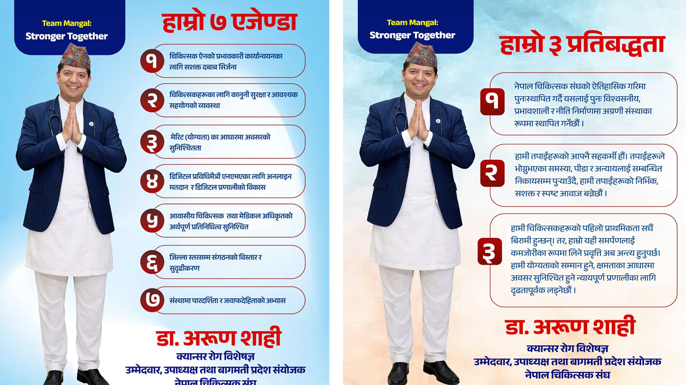 काठमाडौं- नेपाल चिकित्सक संघको आसन्न निर्वाचनलाई लक्षित गर्दै क्यान्सर रोग विशेषज्ञ डा. अरूण शाहीले आफ्नो उम्मेदवारीसँगै ३ प्रमुख प्रतिबद्धता र ७ बुँदे एजेन्डा सार्वजनिक गरेका छन्। नयाँ वर्ष २०८३ को अवसर पारेर जारी गरिएको सन्देशमार्फत उनले पेशागत गरिमा, सुरक्षा र चिकित्सकहरूको अधिकार सुनिश्चित गर्न आफू प्रतिबद्ध रहेको बताएका छन्।