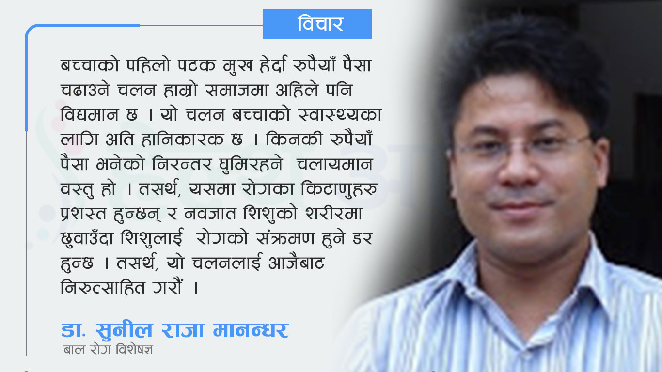 ७. बच्चाको पहिलो पटक मुख हेर्दा रुपैयाँ पैसा चढाउने चलन हाम्रो समाजमा अहिले पनि विद्यमान छ । यो चलन बच्चाको स्वास्थ्यका लागि अति हानिकारक छ । किनकी रुपैयाँ पैसा भनेको निरन्तर घुमिरहने चलायमान वस्तु हो । तसर्थ, यसमा रोगका किटाणुहरु प्रशस्त हुन्छन् र नवजात शिशुको शरीरमा छुवाउँदा शिशुलाई रोगको संक्रमण हुने डर हुन्छ । तसर्थ, यो चलनलाई आजैबाट निरुत्साहित गरौं ।