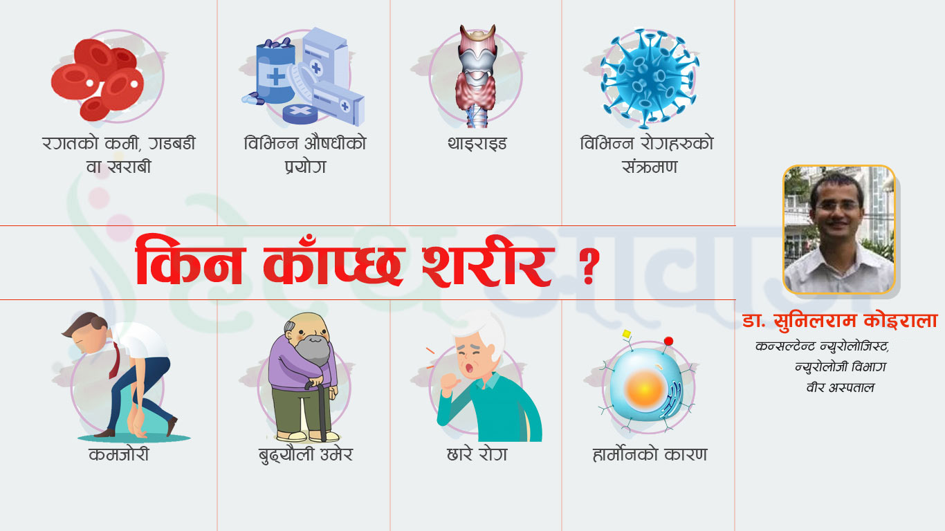 शरीर काँप्ने आफ्नै भिन्न–भिन्न कारणहरु रहेका छन् । शरीरको अवस्थाअनुसार फरक–फरक कारणले शरीर काँप्ने भएकोले हामीले यसै ठोस कारणले गर्दा नै शरीर काँप्छ भन्न सकिदैन । सामान्यतयाः शरीर काँप्ने समस्या नशासँग सम्बन्धित भएतापनि यो कुनै–कुनै समयमा व्यक्तिमा विभिन्न कारणवस देखा पर्छ । त्यसैले व्यक्तिमा शरीर काँप्ने समस्या के कारण देखा पर्यो भन्ने तथ्य भने बिरामीको आवश्यक चेक जाँच नगरी यसै भन्न सकिदैन ।