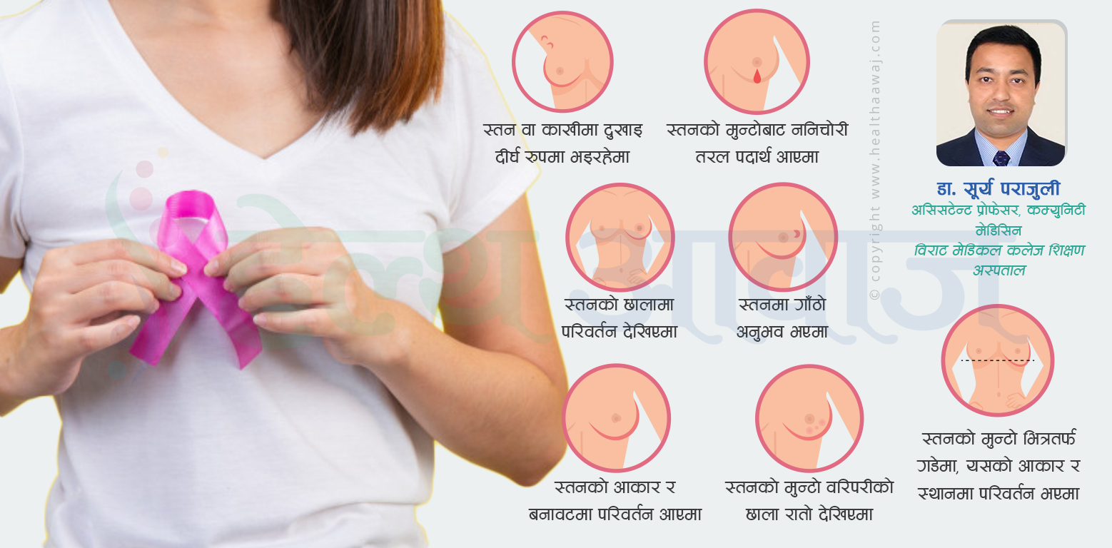 गृहपृष्ठ ∕ जनस्वास्थ्य ∕ स्तन क्यान्सर कसरी पत्ता लगाउने, जोखिमबाट कसरी बाँच्न सकिन्छ ? स्तन क्यान्सर कसरी पत्ता लगाउने, जोखिमबाट कसरी बाँच्न सकिन्छ ? डा. सूर्य पराजुली असिसटेन्ट प्रोफेसर, कम्युनिटी मेडिसिन, विराट मेडिकल कलेज शिक्षण अस्पताल आईतबार, २०८२ फागुन १७ गते, १०:४१ मा प्रकाशित स्तनमा रहेका कोषहरुबाट विकसित हुने यो क्यान्सर पुरुष, महिला दुवैमा हुनसक्छ । शरीरका अरु भागमा पनि फैलन सक्छ । यो क्यान्सर जुनसुकै भूगोल र जातजातिका महिलाहरुमा हुन सक्छ, महिलाको जीवनकालमा प्रत्येक ८ मा १ जनामा पाइएको छ । यो क्यान्सर प्रत्येक २ मिनेटमा १ जनामा पत्ता लाग्ने गरेको छ । यो क्यान्सर महिलामा बढी देखिने भएपनि पुरुषमा पनि हुनसक्छ । ४० वर्षभन्दा बढी उमेरका महिलामा म्यामोग्राफी भन्ने जाँच गर्ने हो भने यो क्यान्सरका कारण मृत्यु हुने जोखिमलाई ४० प्रतिशत घटाउन सक्छौं । यो क्यान्सरलाई समयमै पत्ता लगाउन सक्यौ भने यसबाट हुने मृत्युको जोखिमलाई ४० प्रतिशत घटाउन सक्छौं । यो क्यान्सर हुने ७५ प्रतिशतमा न त कुनै बंशानुगत गुण हुन्छ न त अन्य जोखिम नै हुन्छ । यो क्यान्सर छिटो पत्ता लगाउन सक्यो भने बाच्ने सम्भावना ९८ प्रतिशत सम्म हुन्छ तर ढिलो भएमा २७ प्रतिशततिर झरेर जान्छ । नेपालमा स्तन क्यान्सर ७० प्रतिशत स्तन क्यान्सर ढिलो गरी मात्र पहिचान हुन्छ । ६० प्रतिशत महिलाहरु डिप्रेसनको शिकार भएको पाइन्छ । करिब ६७ प्रतिशत उपचारमा स्तन र काखीमा रहेका लसीका ग्रन्थीलाई निकालेर फालिन्छ । प्यालिएटीभ हेरचाह गर्ने संस्था र प्रबिधि कम छ । ४०—४९ वर्षको उमेर समुहमा यो बढी देखिएको छ । फोक्सोको क्यान्सर र पाठेघरको मुखको क्यान्सरपछि स्तन क्यान्सर प्रमुख क्यान्सरको रुपमा देखिन्छ । प्रति वर्ष करिब २०० जना स्तन क्यान्सरको पहिचान हुने गर्छ । यो प्रत्येक वर्ष ५ प्रतिशतले बढी रहेको छ । तर, समुदायमा कैयौं बिरामीहरु पहिचान नभई बसेका छन् । स्तन क्यान्सरको लक्षण र चिन्हहरु के—के हुन सक्छन् ? स्तन वा काखीमा दुखाइ दीर्घ रुपमा भइरहेमा स्तनको छालामा परिवर्तन देखिएमा स्तनको आकार र बनावटमा परिवर्तन आएमा स्तनको मुन्टोबाट ननिचोरी तरल पदार्थ आएमा स्तनको मुन्टो भित्रतर्फ गडेमा, यसको आकार र स्थानमा परिवर्तन भएमा स्तनमा गाँठो अनुभव भएमा स्तनको मुन्टो वरिपरीको छाला रातो देखिएमा काखीमा वा घाँटीको छेउछाउ लासिका ग्रन्थी बढेमा स्तन क्यान्सरको जोखिम कसलाई बढी छ? ढिलो सन्तान जन्माउनेहरु कम उमेरमै महिनावारी सुरु हुने (१२ वर्ष पहिले) र ढिलो उमेरमा महिनावारी सुक्ने (५५ वर्षपछि) पहिले सन्तान ढिलो जन्माउने (३० वर्षपछि) स्तनपान कम गराउने बढी चिल्लो बोसोयुक्त खाना खाने चुरोट र अत्याधिक रक्सीको सेवन गर्ने विकिरण
