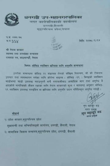 गृहपृष्ठ ∕ सुदूरपश्चिम प्रदेश ∕ धनगढी उपमहानगरद्वारा भ्याक्सिन खरिदका लागि स्वास्थ्य मन्त्रालयसँग अनुमति माग धनगढी उपमहानगरद्वारा भ्याक्सिन खरिदका लागि स्वास्थ्य मन्त्रालयसँग अनुमति माग हेल्थ आवाज शुक्रबार, २०७८ जेठ १४ गते, १२:५६ मा प्रकाशित धनगढी–सुदूरपश्चिमको धनगढी उपमहानगरपालिकाले कोभिड–१९ विरुद्धको भ्याक्सिन खरिदका लागि स्वास्थ्य तथा जनसंख्या मन्त्रालयसँग अनुमति मागेको छ । शुक्रबार धनगढीका मेयर नृप वडले स्वास्थ्य मन्त्रालयलाई पत्र लेखेर खोप खरिदका लागि अनुमति मागेका हुन् । उनले नगरवासीबाट कोभिड–१९ विरुद्धको खोप चाडो उपलब्ध गराउनुपर्ने अत्याधिक माग आएको पत्रमा उल्लेख गरेका छन् । मेयर वडले नागरिकको जीवन रक्षाका लागि नेपाल सरकारको मूल्य र मापदण्डअनुसार कोभिड–१९ भ्याक्सिन उपलब्ध गराइदिन तथा खरिदका लागि अनुमति प्रदान गर्न माग गरेका छन् । धनगढीको उक्त पत्र सुदूरपश्चिम प्रदेश सरकारका मुख्यमन्त्री र सामाजिक विकास मन्त्रालयलाई बोधार्थ पठाइएको छ । क्याटेगोरी : सुदूरपश्चिम प्रदेश तपाईको प्रतिक्रिया दिनुहोस सम्बन्धित समाचार शहीद दशरथ चन्द स्वास्थ्य विज्ञान विश्वविद्यालयमा प्राध्यापक र उप–प्राध्यापक पदमा… शहीद दशरथ चन्द स्वास्थ्य विज्ञान विश्वविद्यालयद्वारा शैक्षिक कार्यक्रम सञ्चालनका लागि… शहीद दशरथ चन्द स्वास्थ्य विज्ञान विश्वविद्यालयले माग्यो २६ प्राध्यापक र… सुदूरपश्चिम प्रदेशः जनस्वास्थ्य प्रशासकका रिक्त रहेका सबै दरबन्दी पदपूर्ति गेटा अस्पतालमा विशेषज्ञ सेवा थपिए, आईसीयु सेवा सञ्चालनमा पोषणको ‘स्मार्ट सर्वेक्षण’ कुपोषणको बोझ : २५ प्रतिशतमा पुड्कोपना र… धेरै पढिएका १ बंगलादेशमा एमबीबीएस र बिडिएस पढिरहेका विद्यार्थीले बंगलादेशमै इन्टर्न गर्नुपर्ने २ नर्सिङ लाइसेन्स परीक्षा २४ फागुनमा ३ स्वास्थ्य सेवाः खर्च होइन, लगानी हो भनेर कहिले बुझ्ने? ४ बालबालिकामा देखिने दन्त सडनः अर्ली चाइल्डहुड केरिज ५ ७ अर्ब १५ करोडमा ठेक्का सम्झौता भएको १२०० शय्याको लुम्बिनी अस्पतालको भौतिक प्रगति ३८.५ प्रतिशत ६ किष्ट टिचिङ हस्पिटलमा मुख स्वास्थ्य सम्बन्धि जनचेतनामूलक कार्यक्रम सम्पन्न ७ जुम्लाका १२७७ जना किशोरीलाई एचपीभी खोप लगाइने TFN ट्रेण्डिङ मनमोहन प्राविधिक विश्वविद्यालयको प्रस्तावः धनकुटा अस्पताललाई ३०० शय्याको शिक्षण अस्पताल बनाउने जुम्ला कारागारका कैदी बन्दीको स्वास्थ्य परीक्षण रेबिज भ्याक्सिनको हाहाकारः सरकारी अस्पताल रित्तै, बिरामी चर्को शुल्क तिरेर निजीमा जान बाध्य अनुमति नलिइ पीसीआर परीक्षण, स्वास्थ्य मन्त्रालय मौन बालबालिकामा देखिने दन्त सडनः अर्ली चाइल्डहुड केरिज भाटभटेनीमा होमा जापानी हे